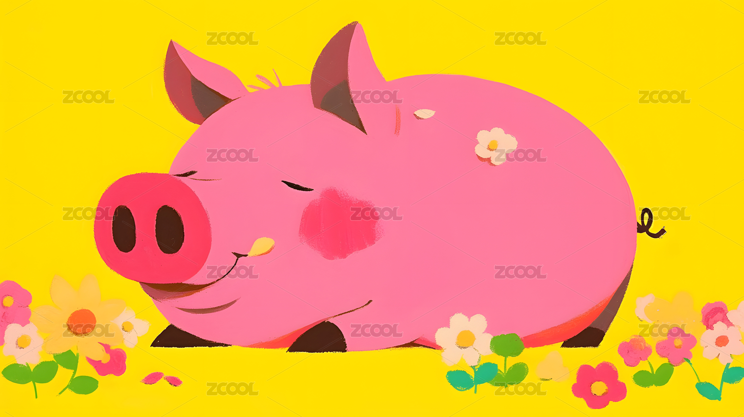 可爱小猪和野花扁平插画