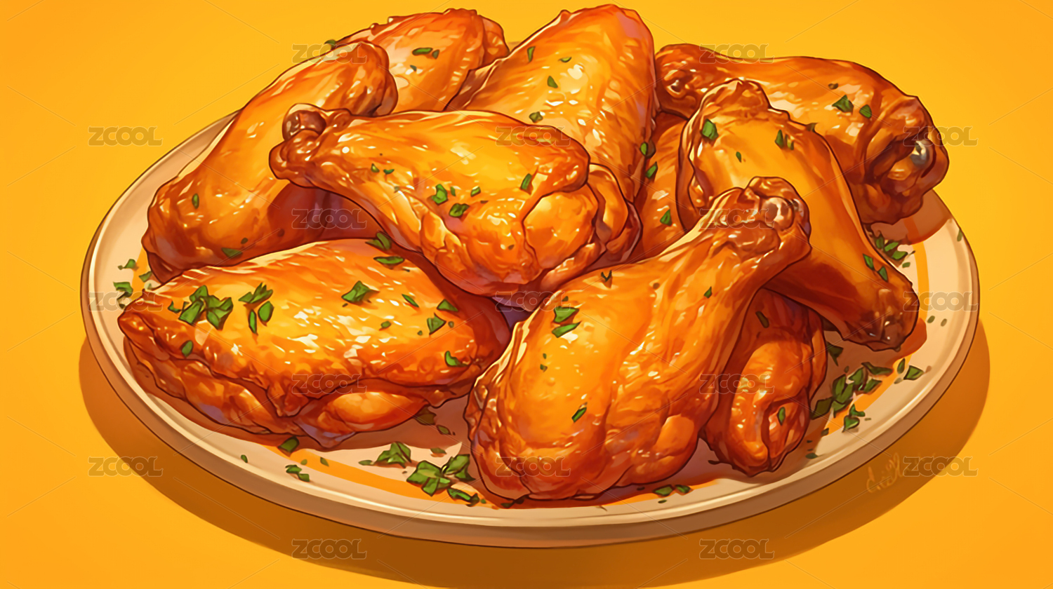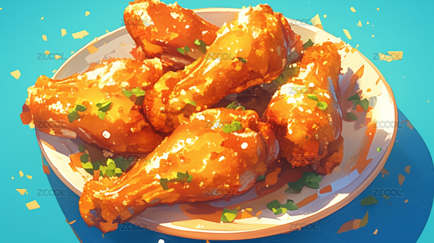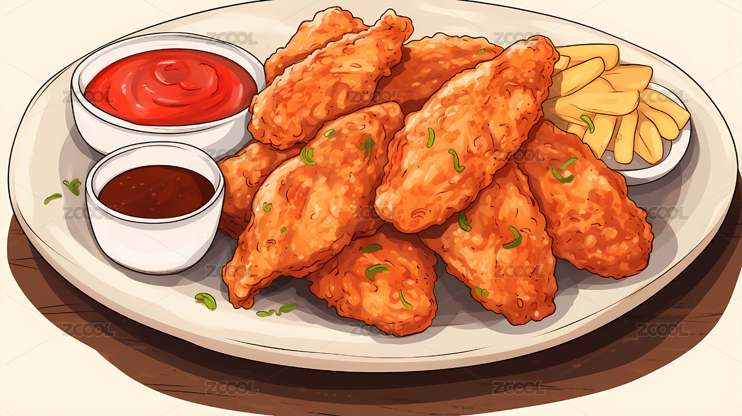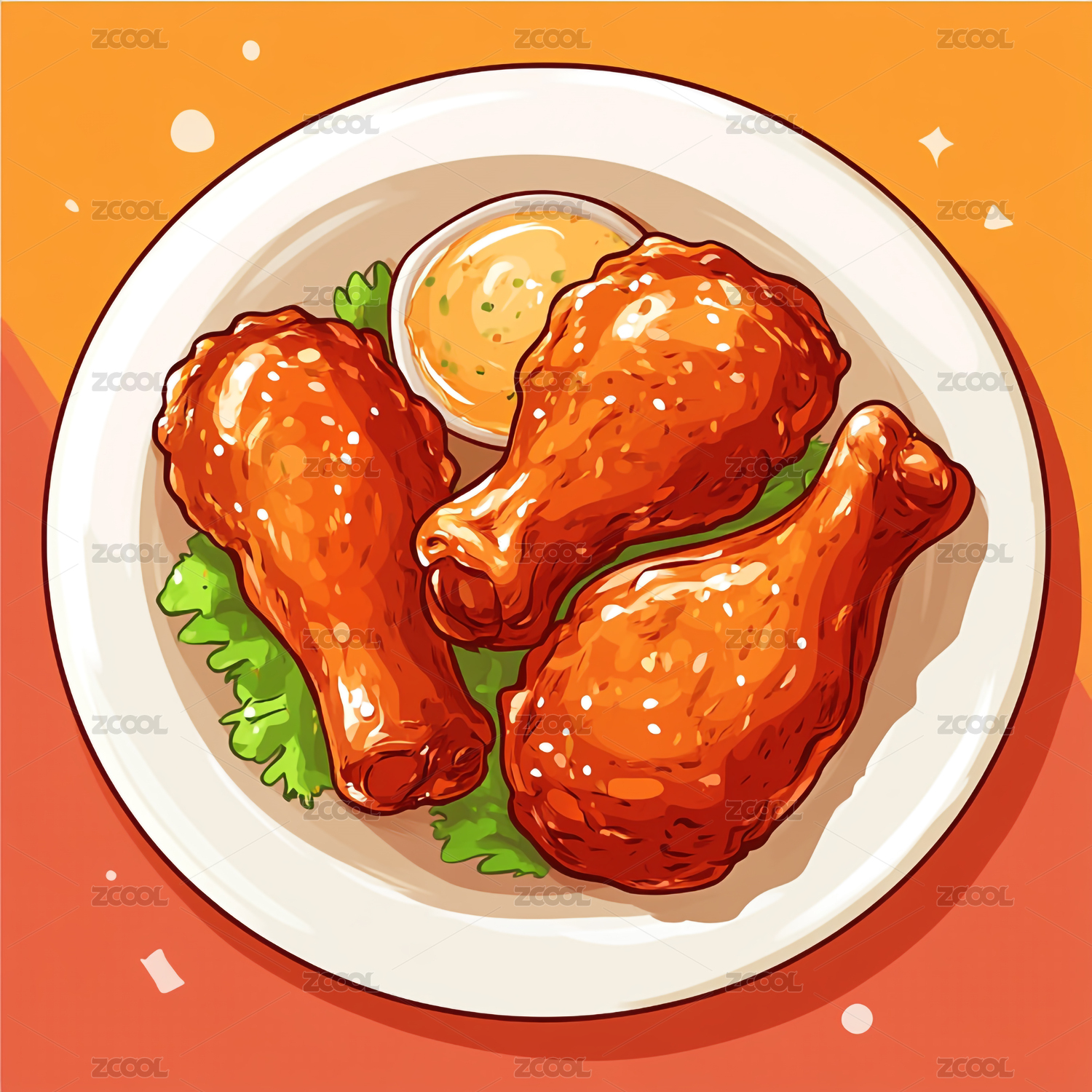 炸鸡翅,蘸酱,芹菜,卤味,饮品,餐盘,插画,美食,餐点,鸡肉