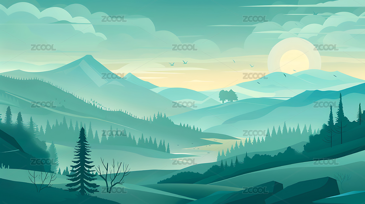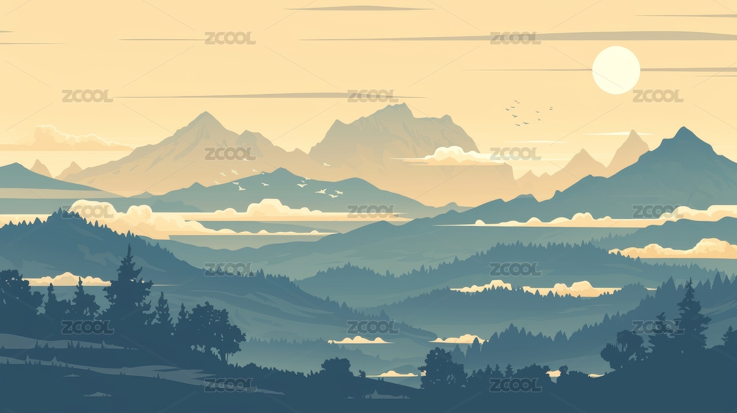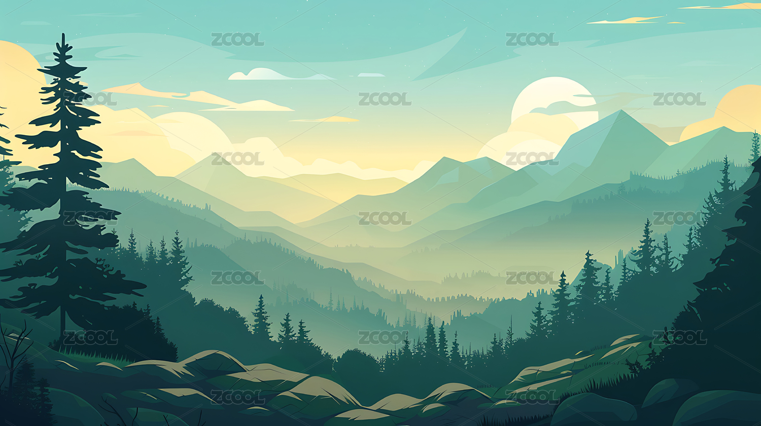 山水,森林,山脉,树木,云雾,风景,山景,自然,插画,柔和