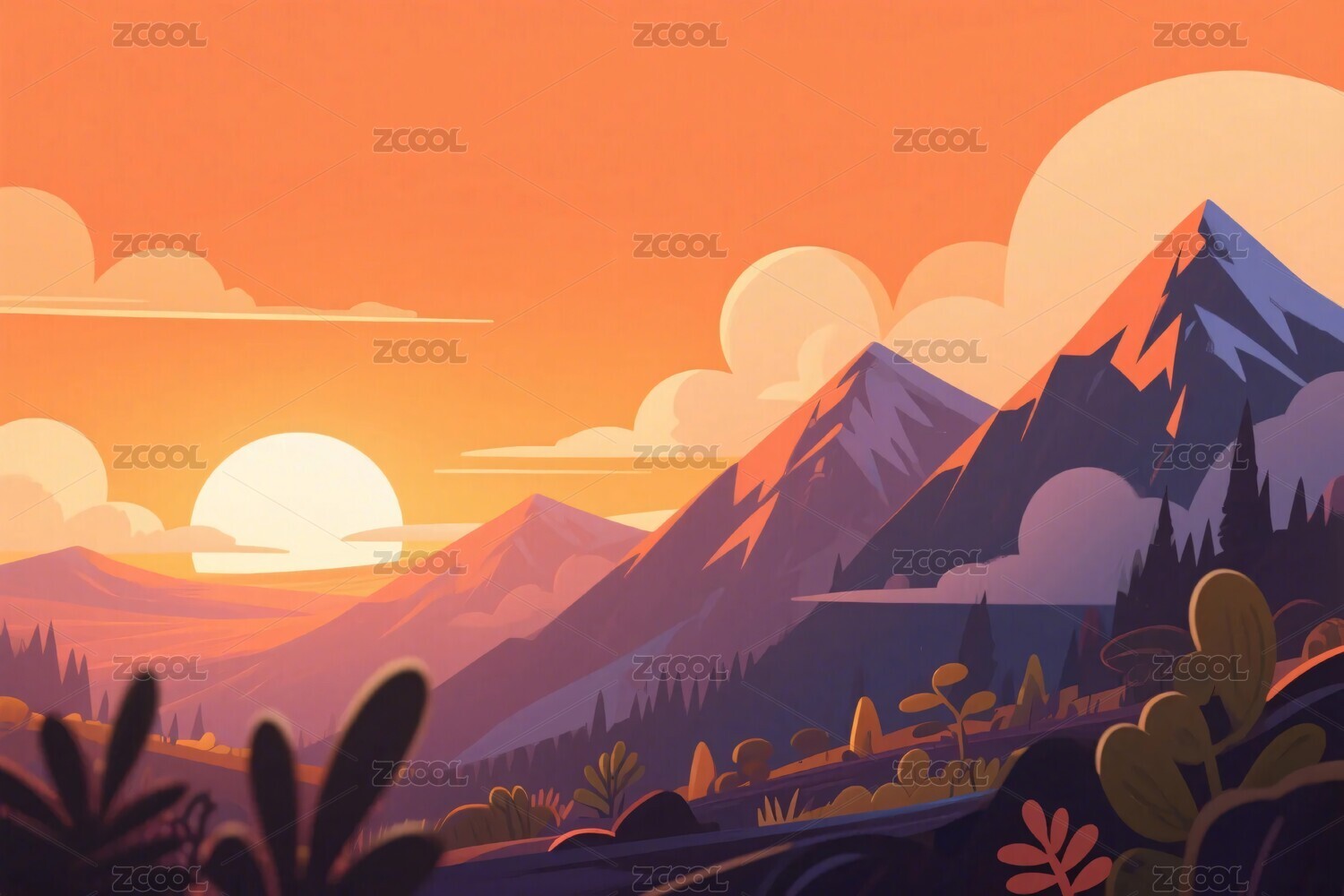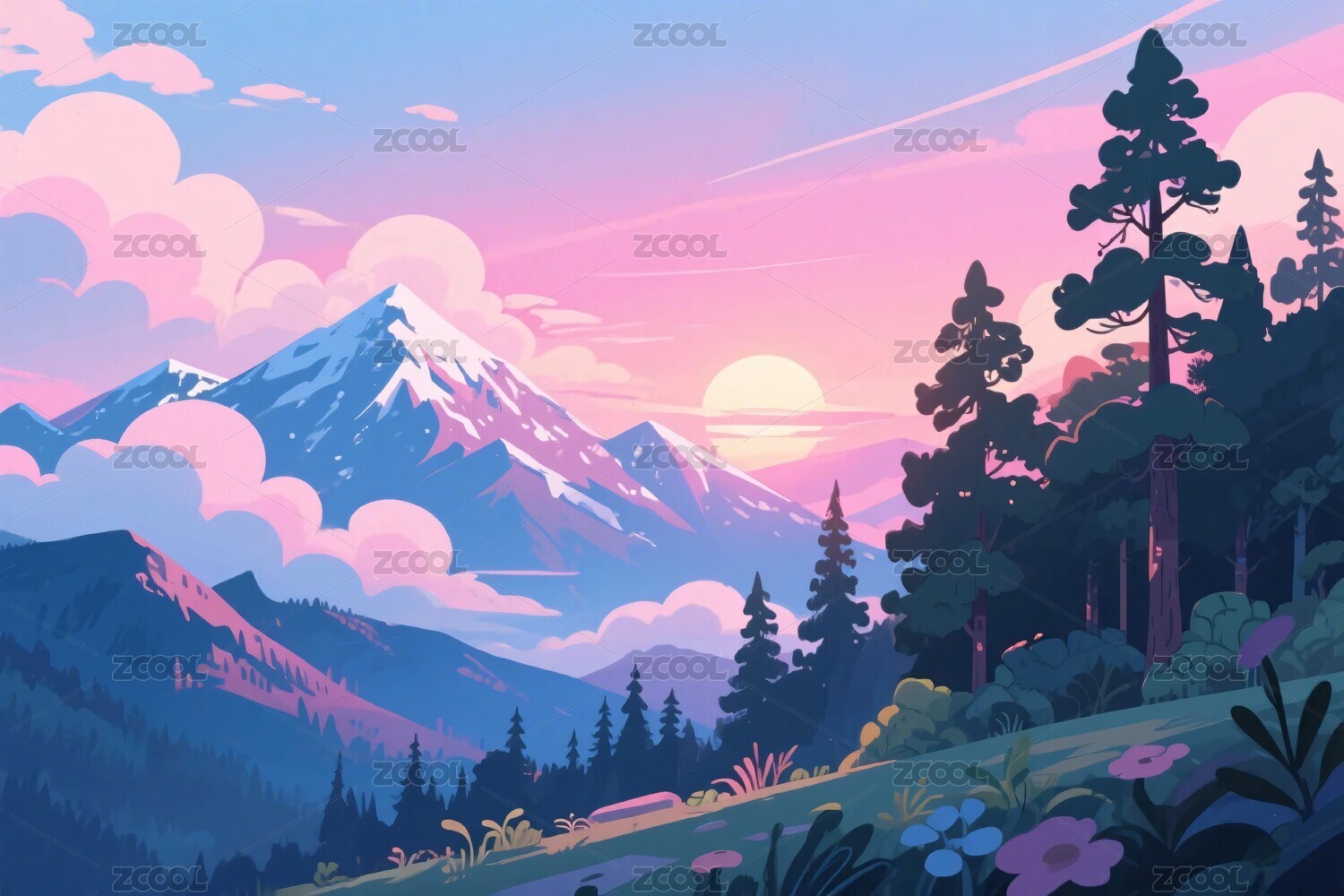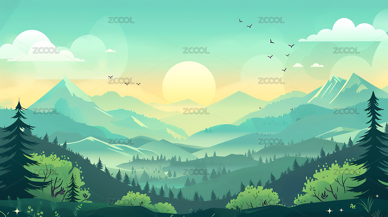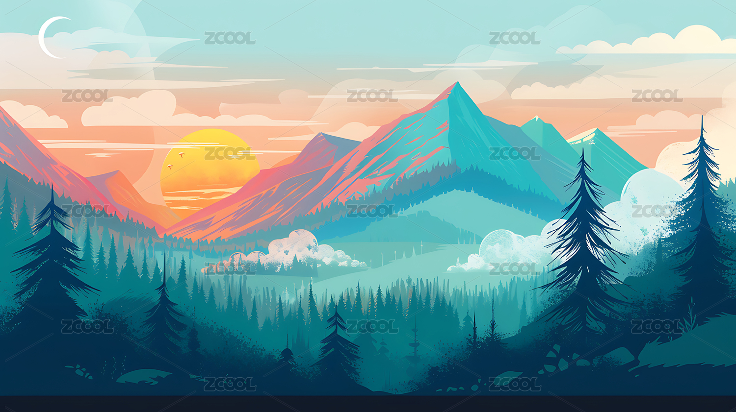 山水,森林,山脉,树木,云雾,风景,山景,自然,插画,柔和