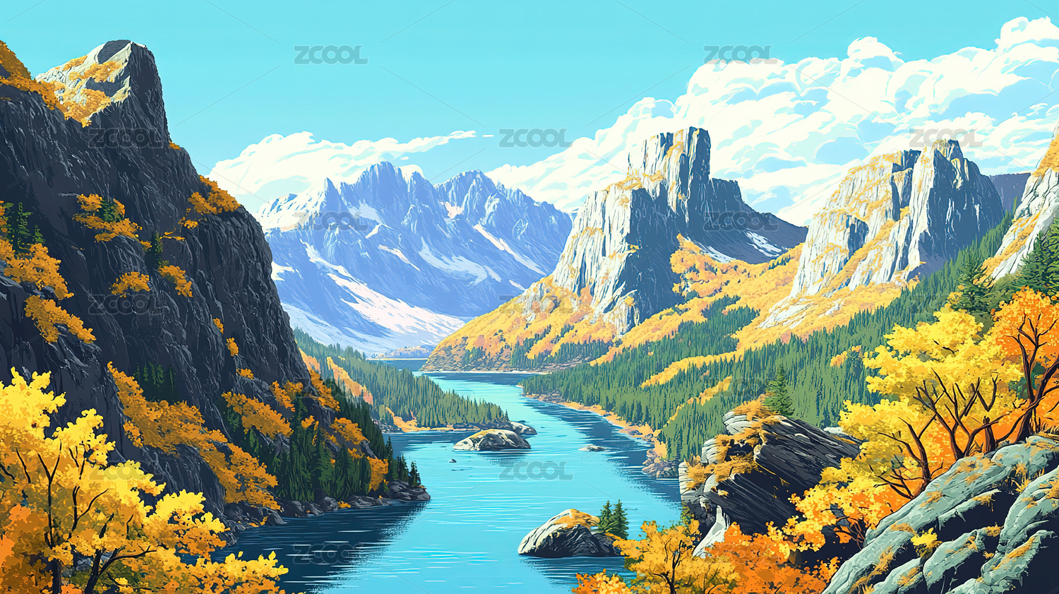 山水,河流,小船,森林,山峦,风景,插画,自然,宁静,艺术