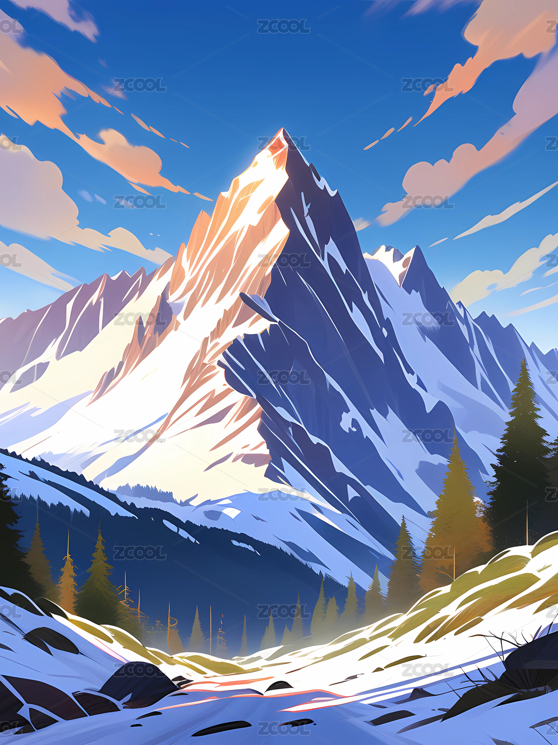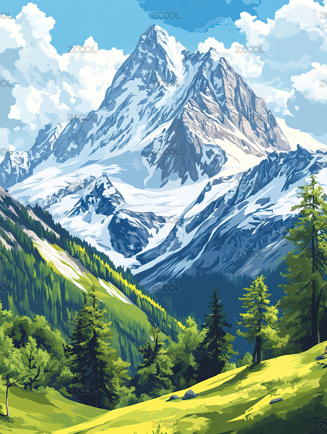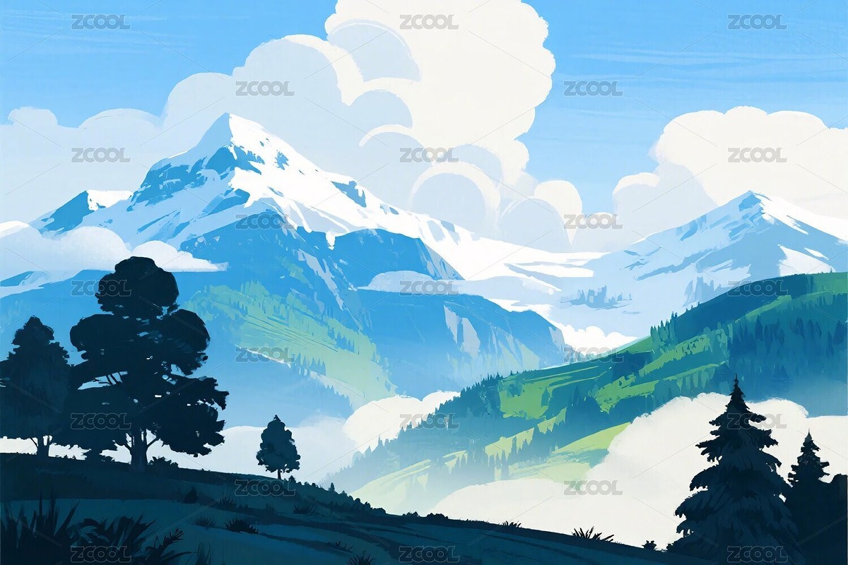 雪山,森林,树木,天空,山水,插画,自然,风景,风景画,山林