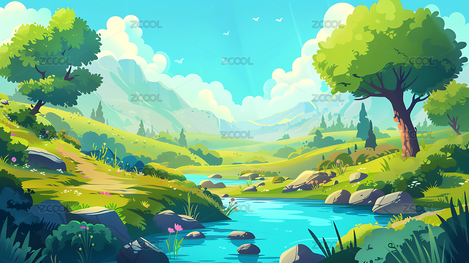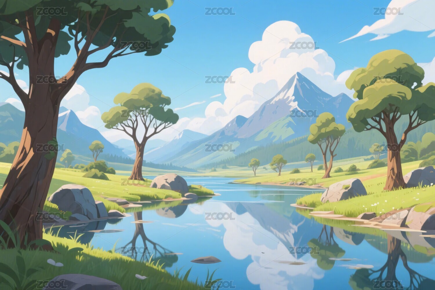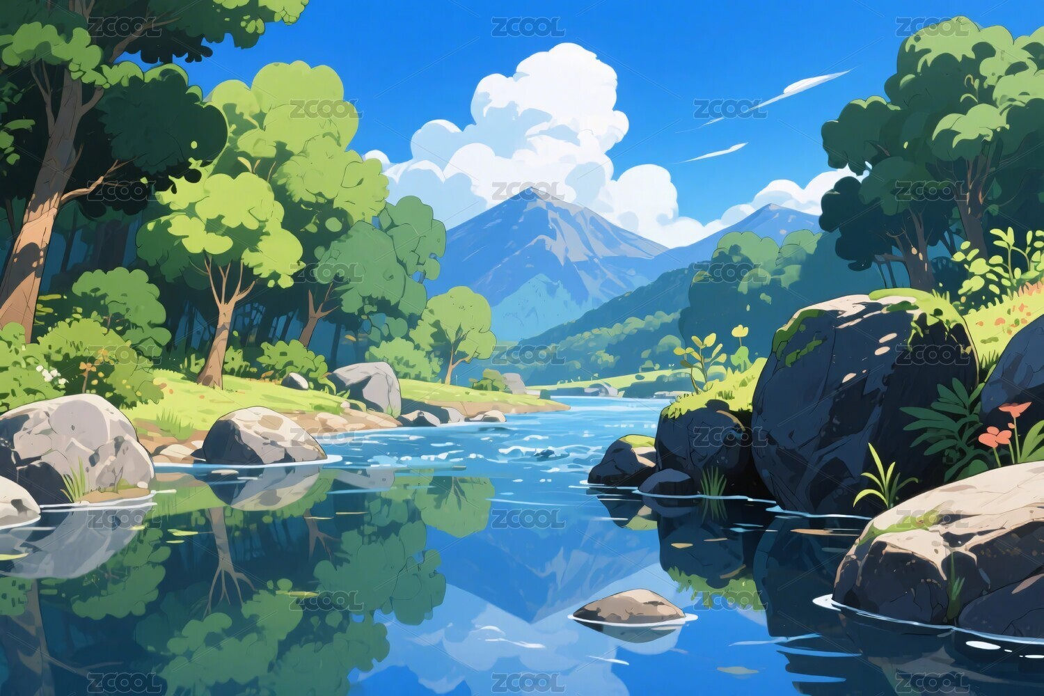 山水,风景,河流,树木,山峦,岩石,卡通,插画,背景,自然