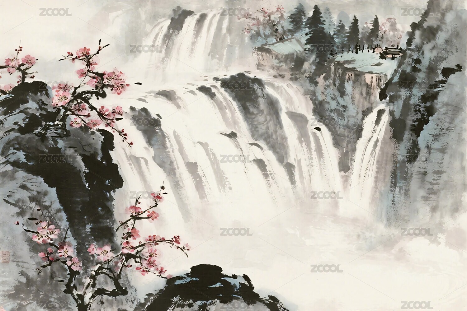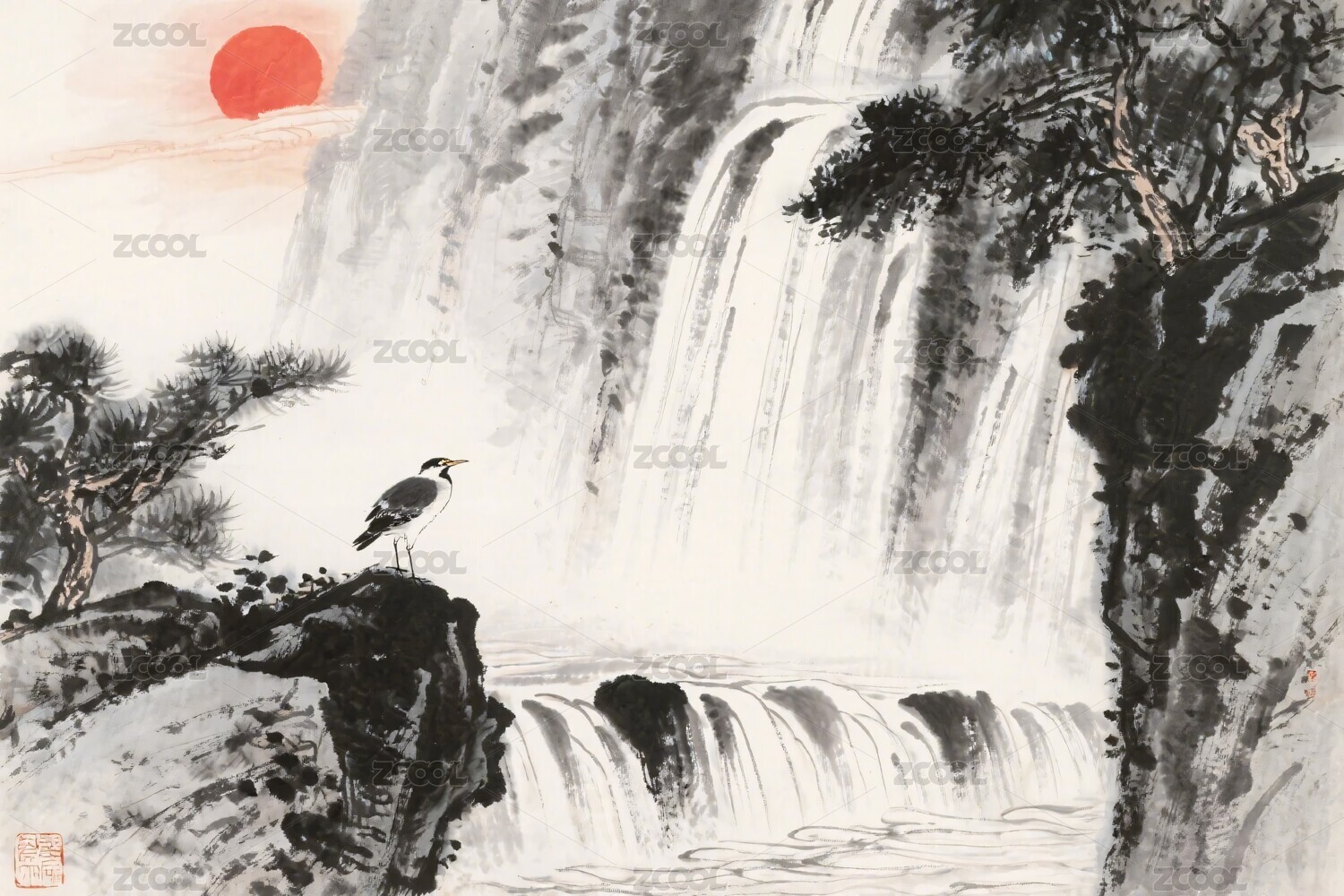 瀑布,山水,树木,飞鸟,山峦,岩石,水墨画,山水画,国风,传统绘画