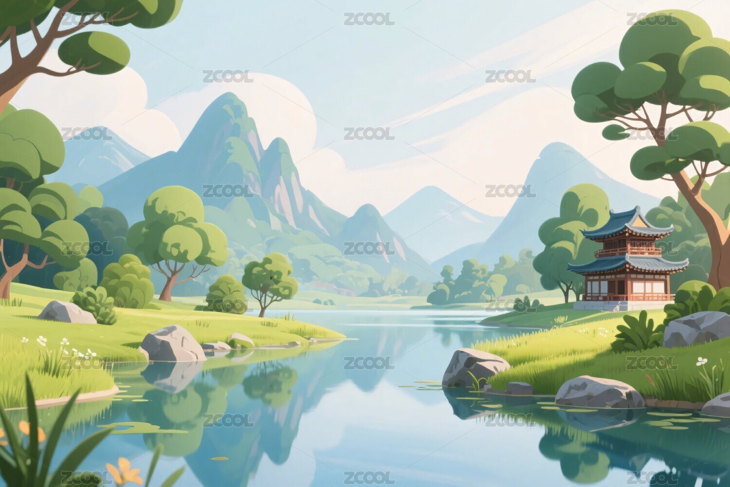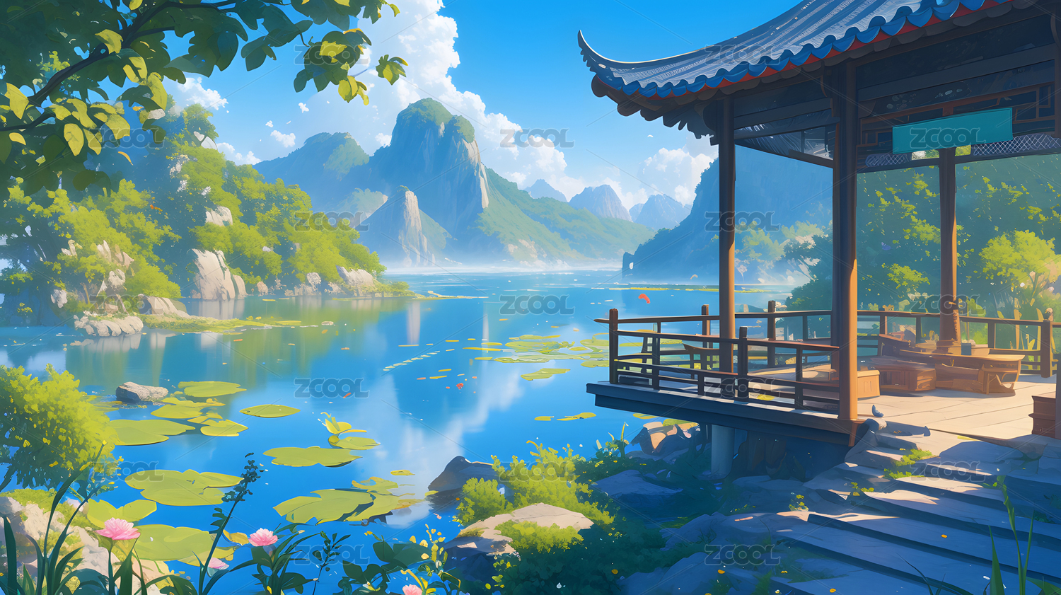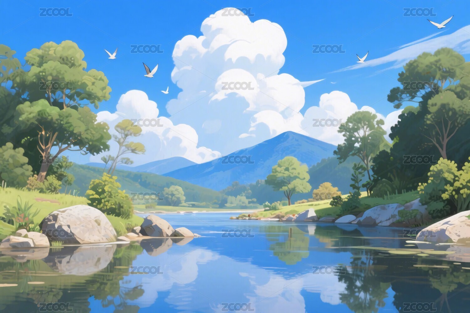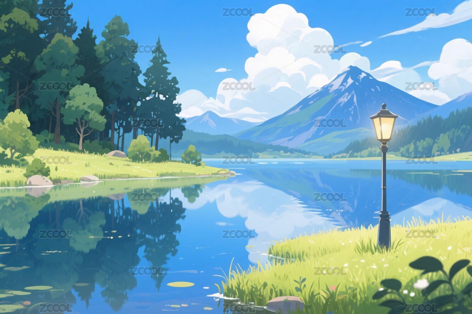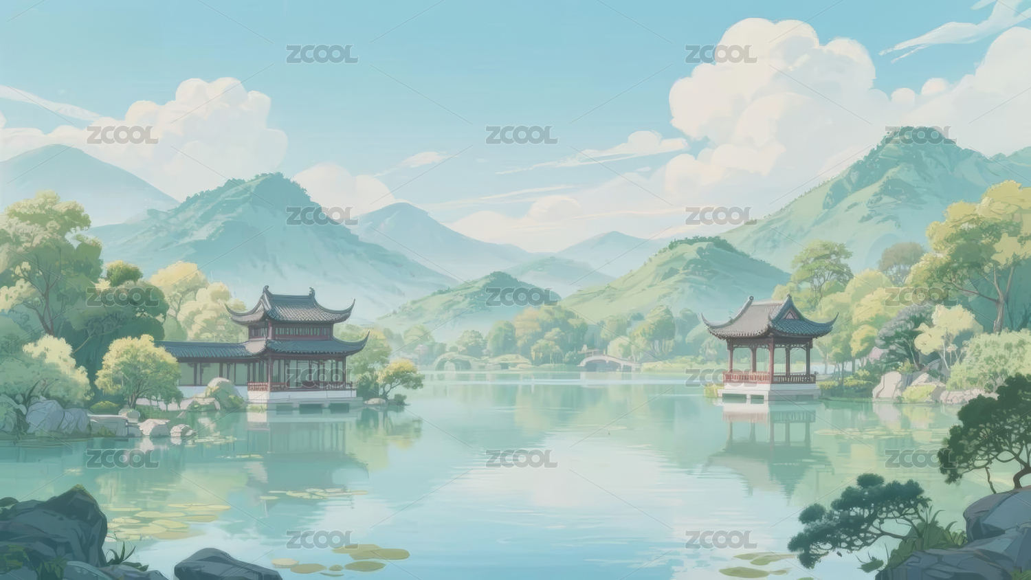 山水,湖泊,房屋,森林,天空,白云,建筑,倒影,自然风景,宁静