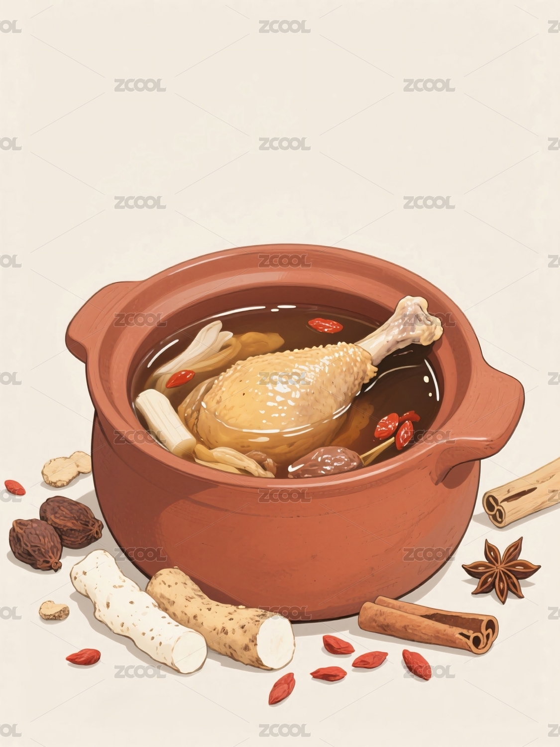 陶瓷煲汤里面炖煮排骨和蔬菜