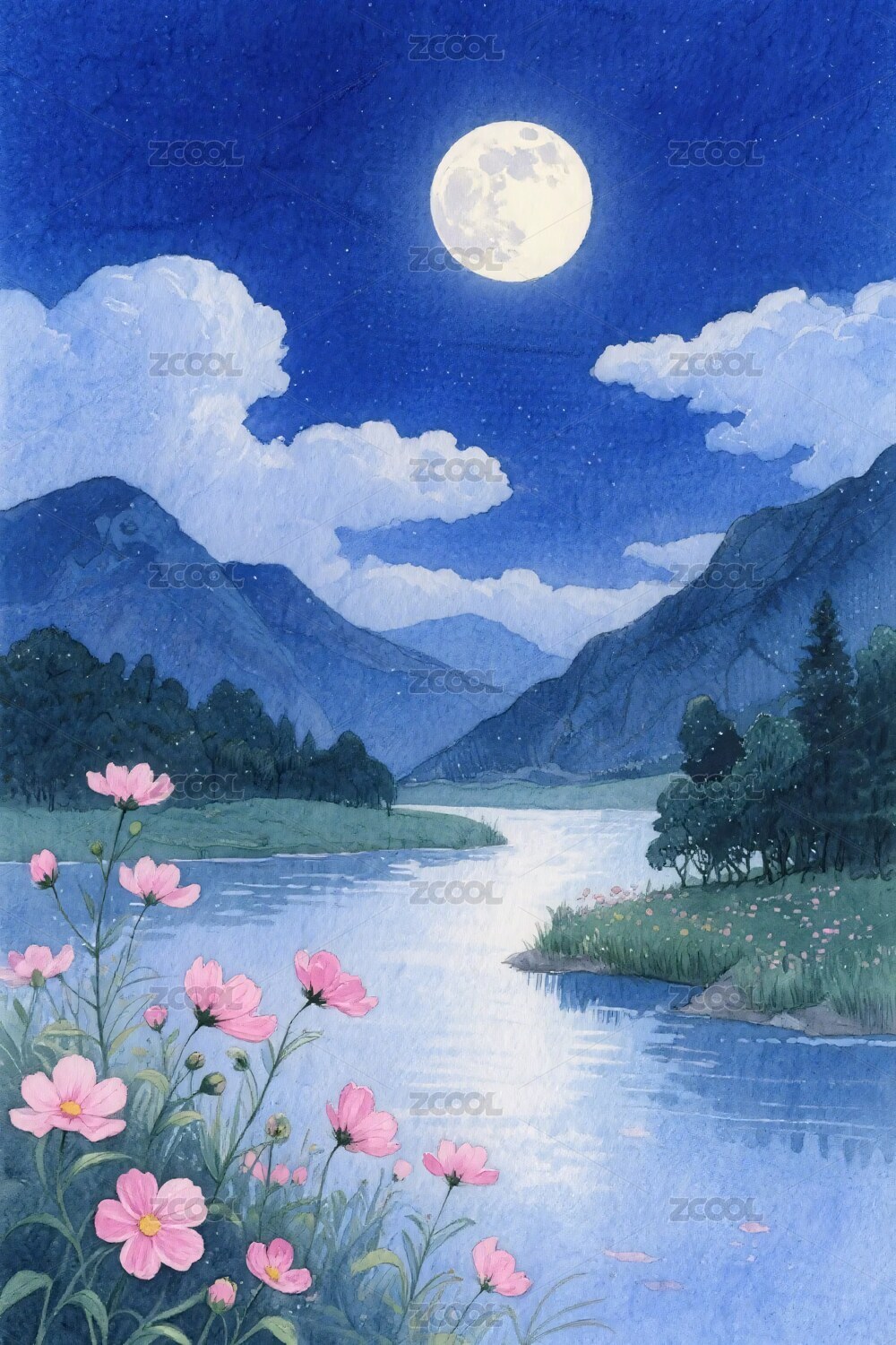 山水,月亮,河流,森林,夜晚,美景,插画,自然风光,静谧,宁静