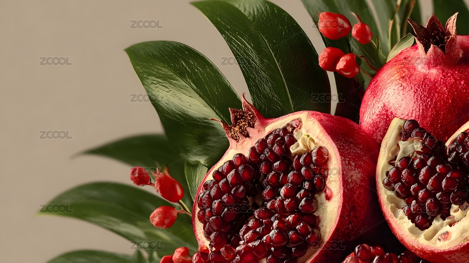 新鲜石榴与绿叶水珠画面