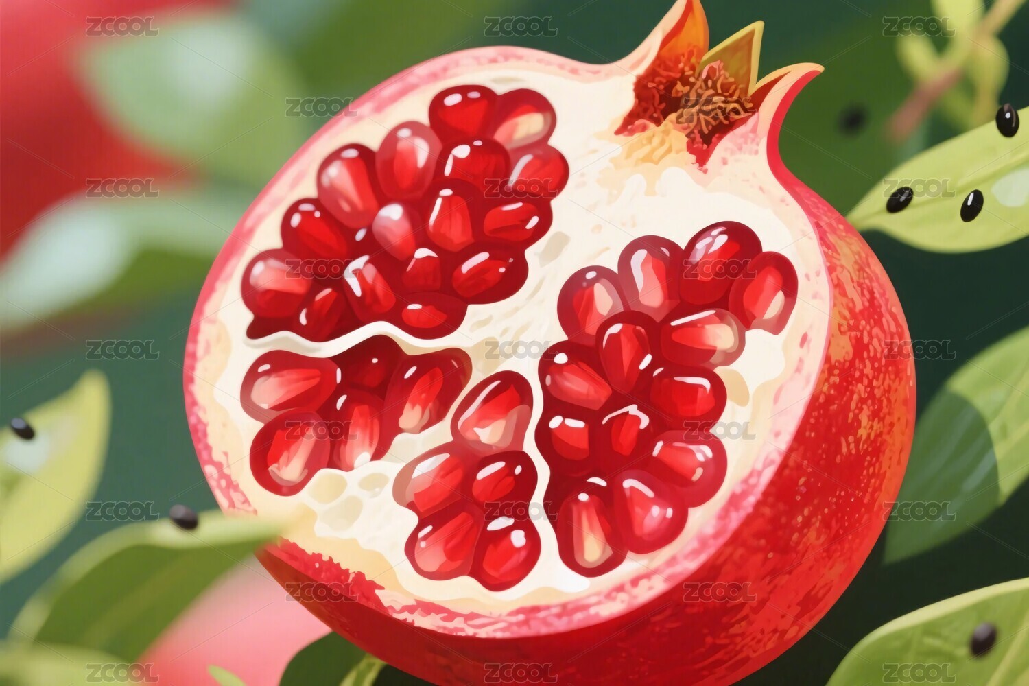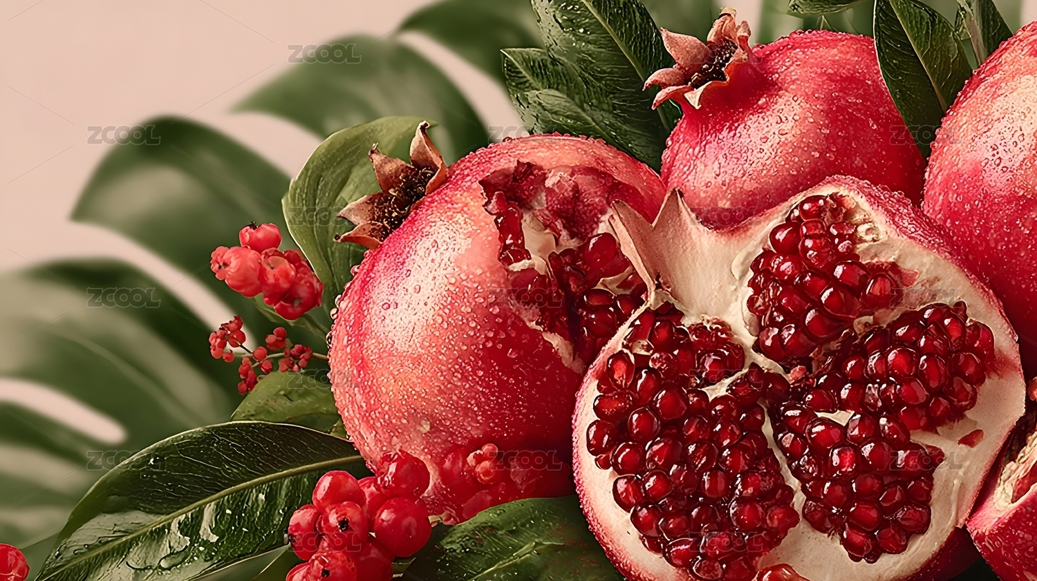 新鲜石榴与绿叶水珠画面
