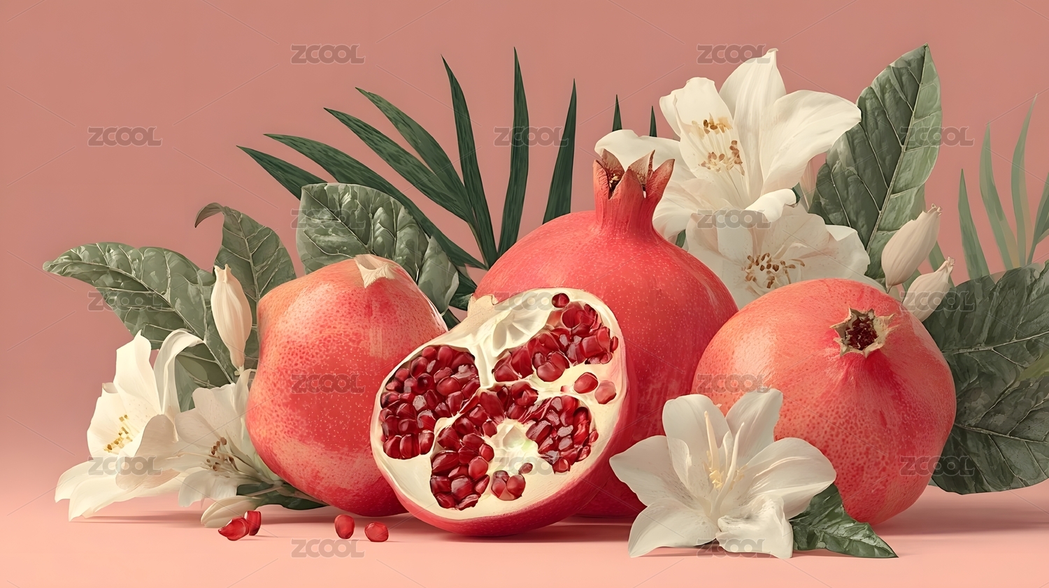 石榴与绿叶的静物组合