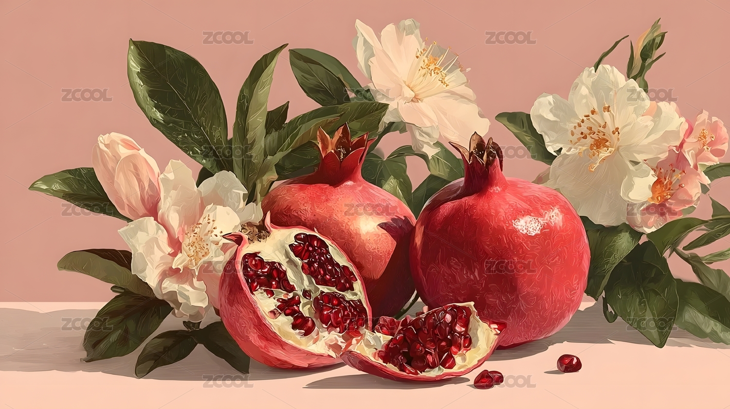 石榴果实与花卉的精美插画
