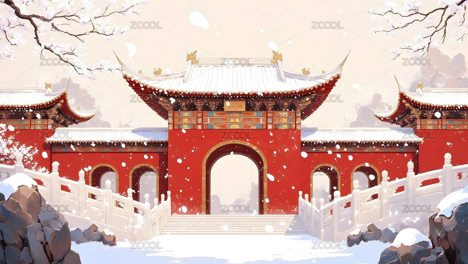 枝干,树木,风景,装饰,雪景,石块,石阶,建筑群,屋顶,屋檐