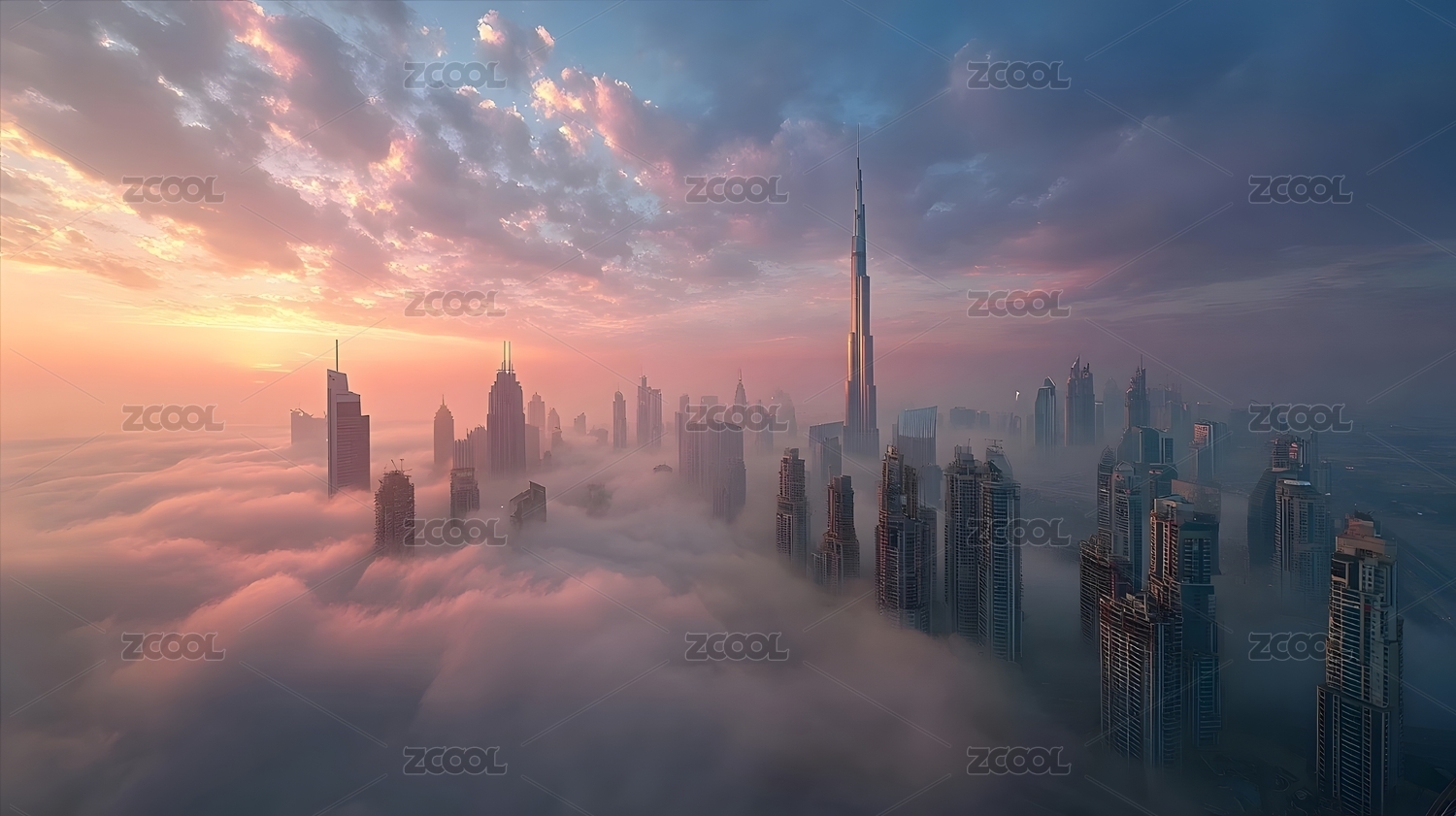 薄雾中阳光洒在摩天高楼上的城市早晨