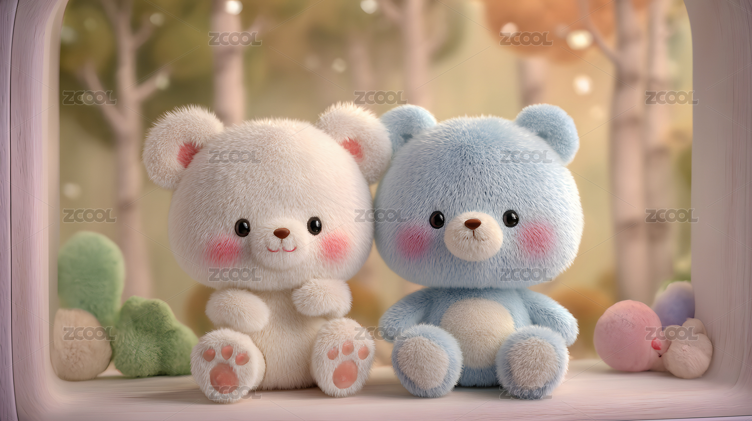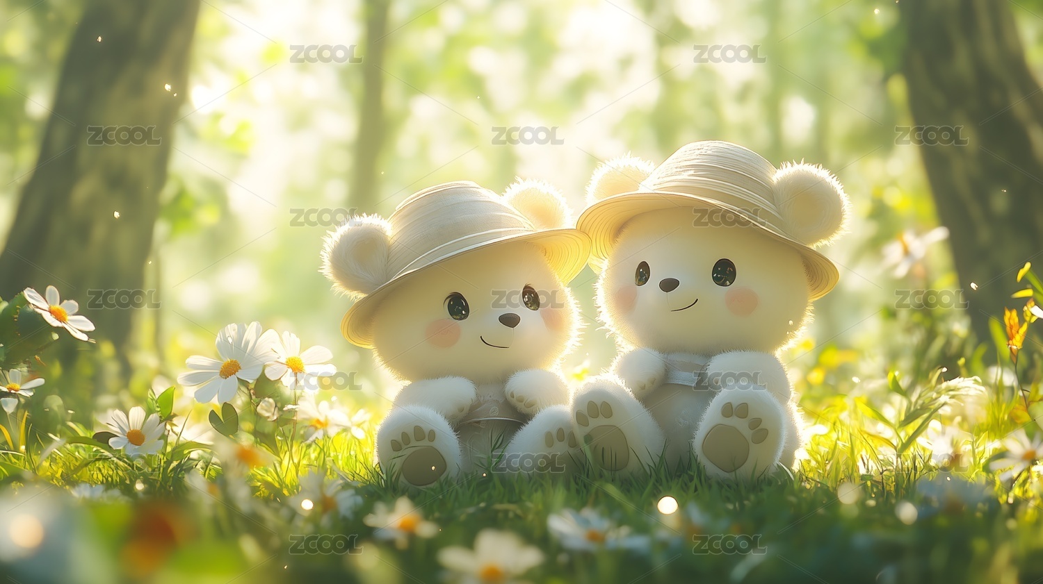 卡通,小熊,小狐狸,森林,草地,阳光,花朵,立体,插画,卡通形象