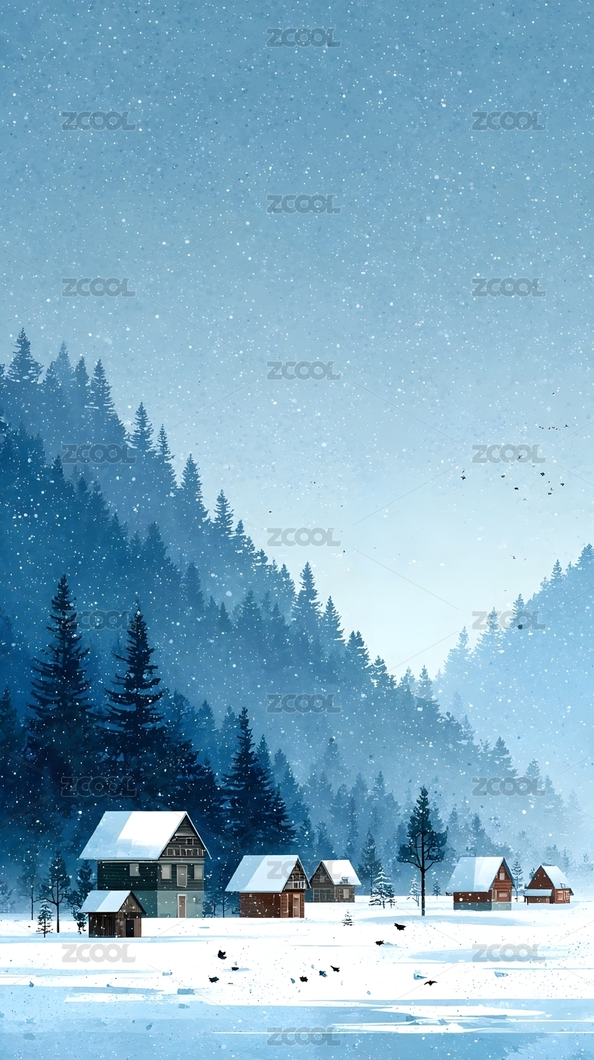 夜幕下白雪皑皑的田野上的房屋和树木的低角