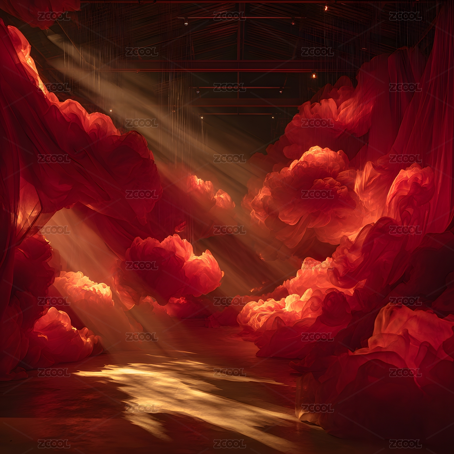 布料,云朵状物体,光束,织物,室内空间,展厅,艺术空间,天花板下,悬挂,堆叠