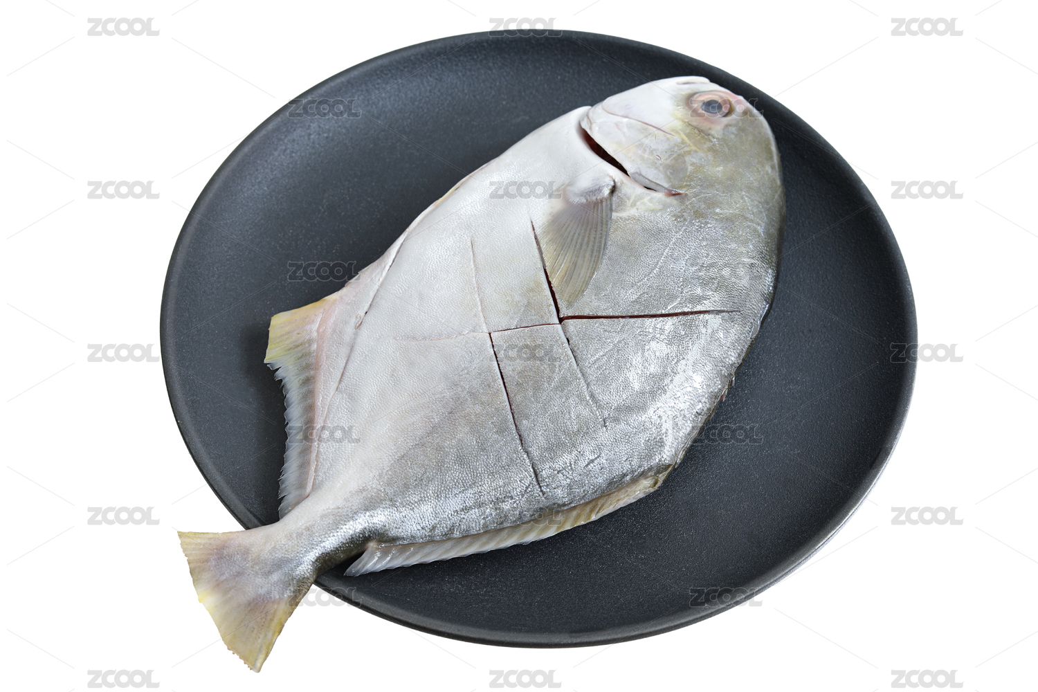 盘子上的新鲜食材海鲜金鲳鱼的白底图