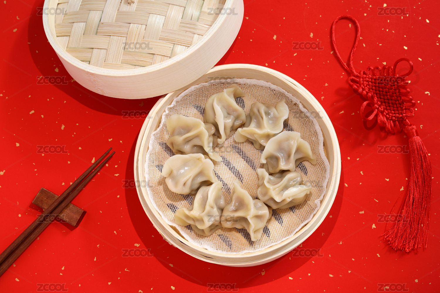 红色桌面上的一蒸笼中国春节年夜饭美食饺子