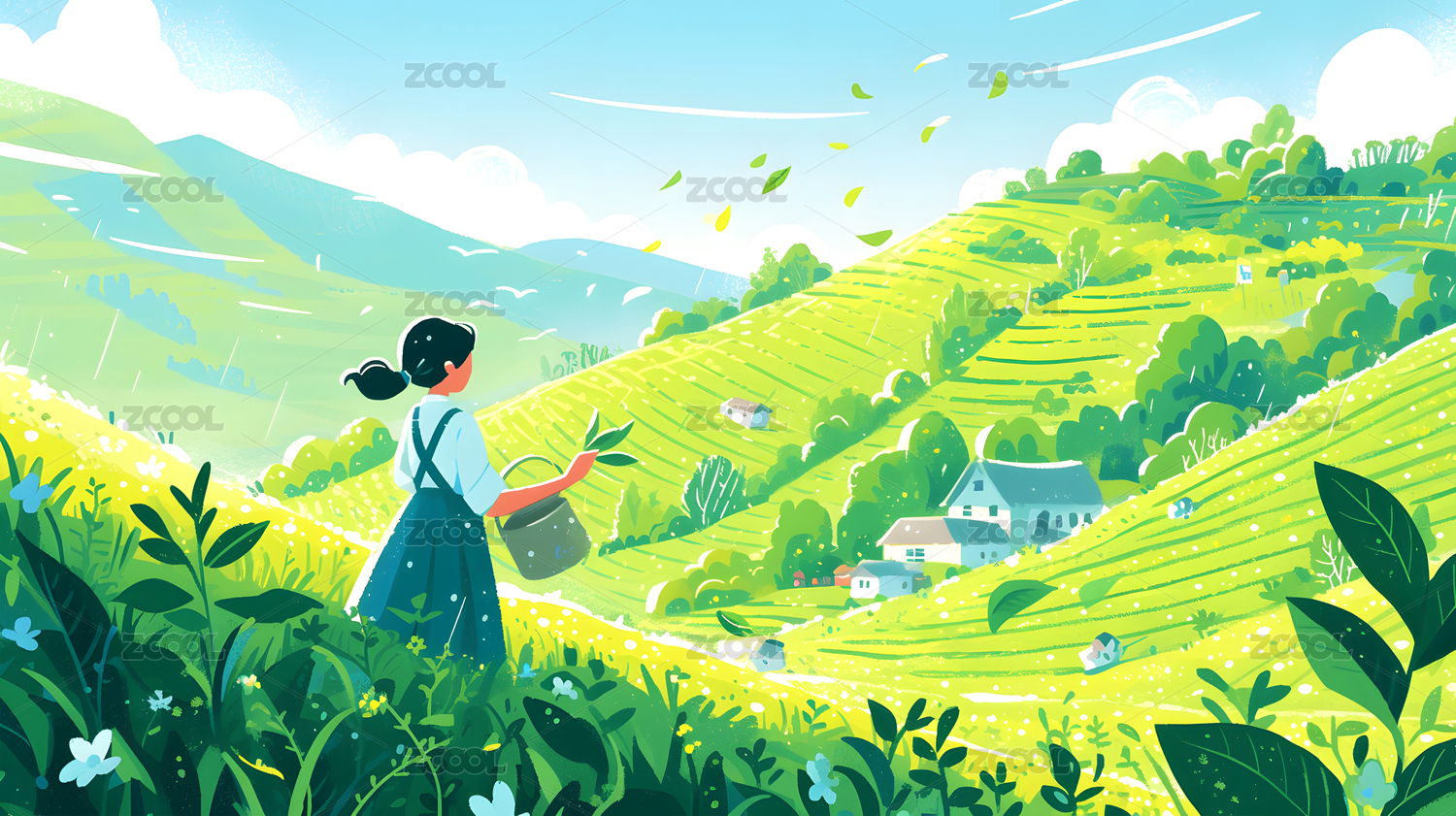 长发少女拎着篮子在茶园采摘茶叶3D插画