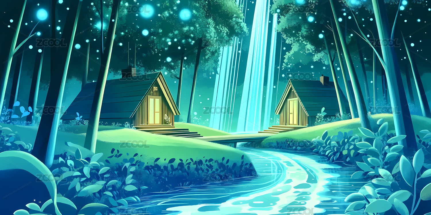 梦幻森林中的小屋夜景