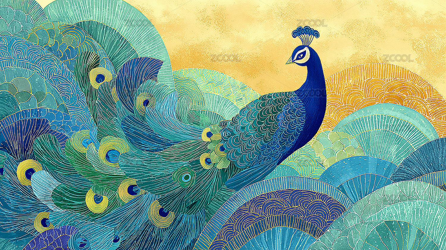 孔雀舞,孔雀开屏,绿孔雀,吉祥鸟,鸟儿,插画