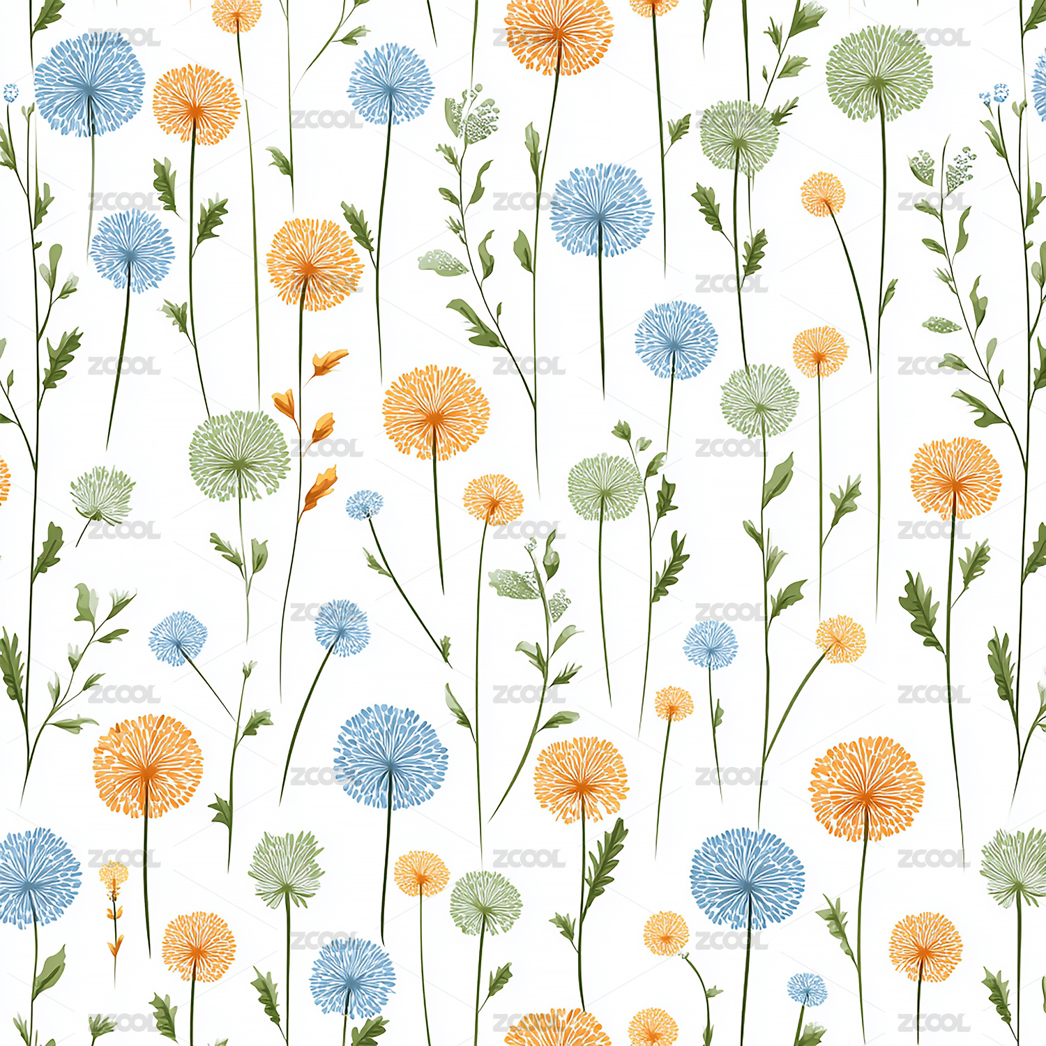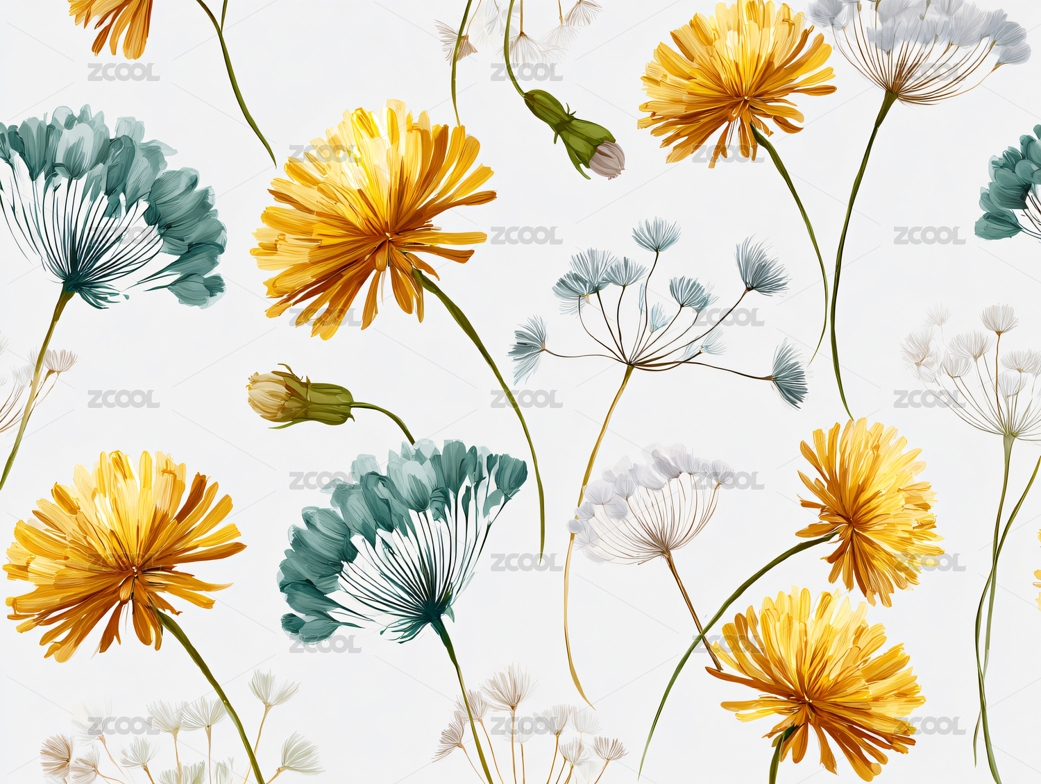 白黄粉三色蒲公英植物水彩无缝图案纹理