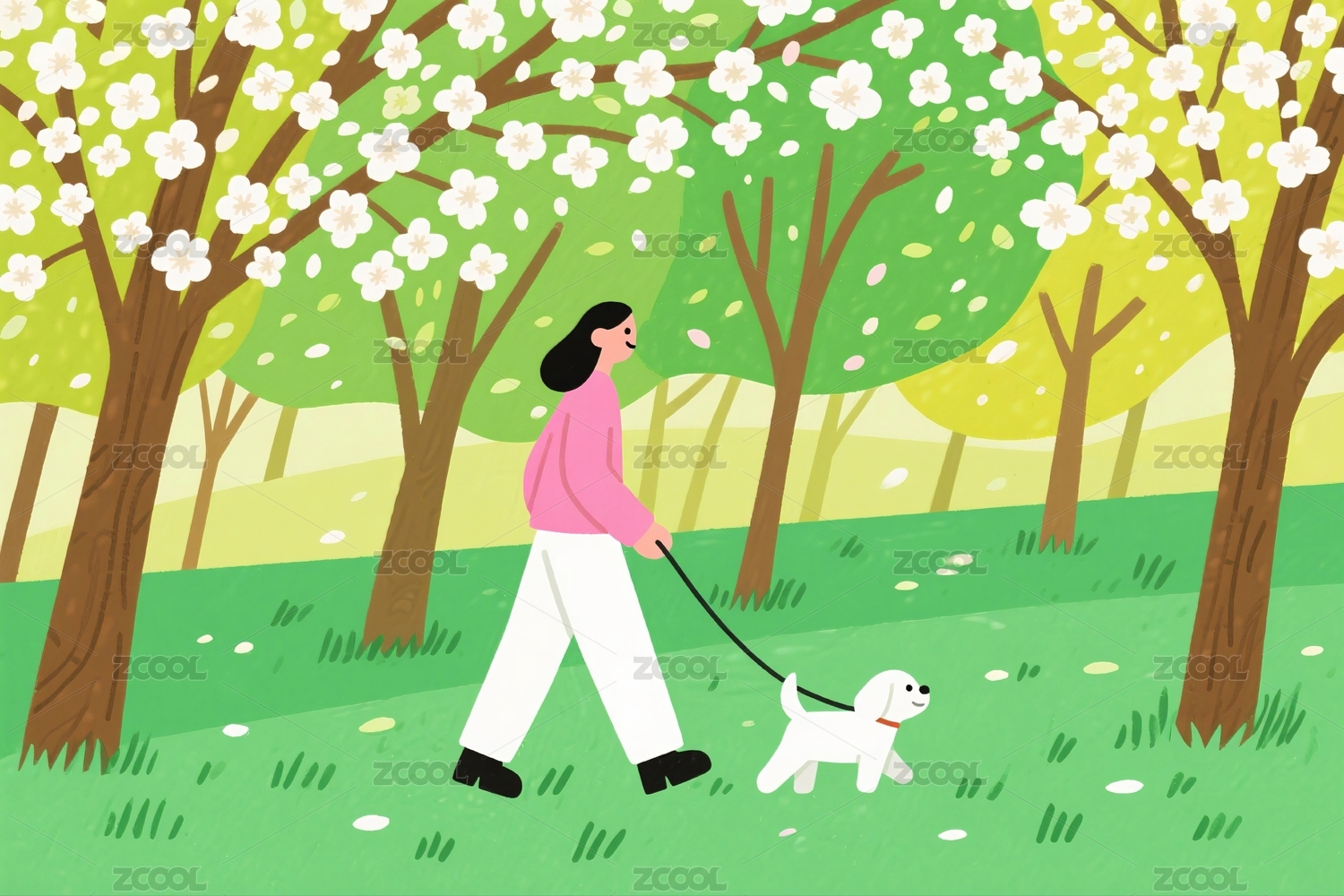 女人湖边遛狗卡通