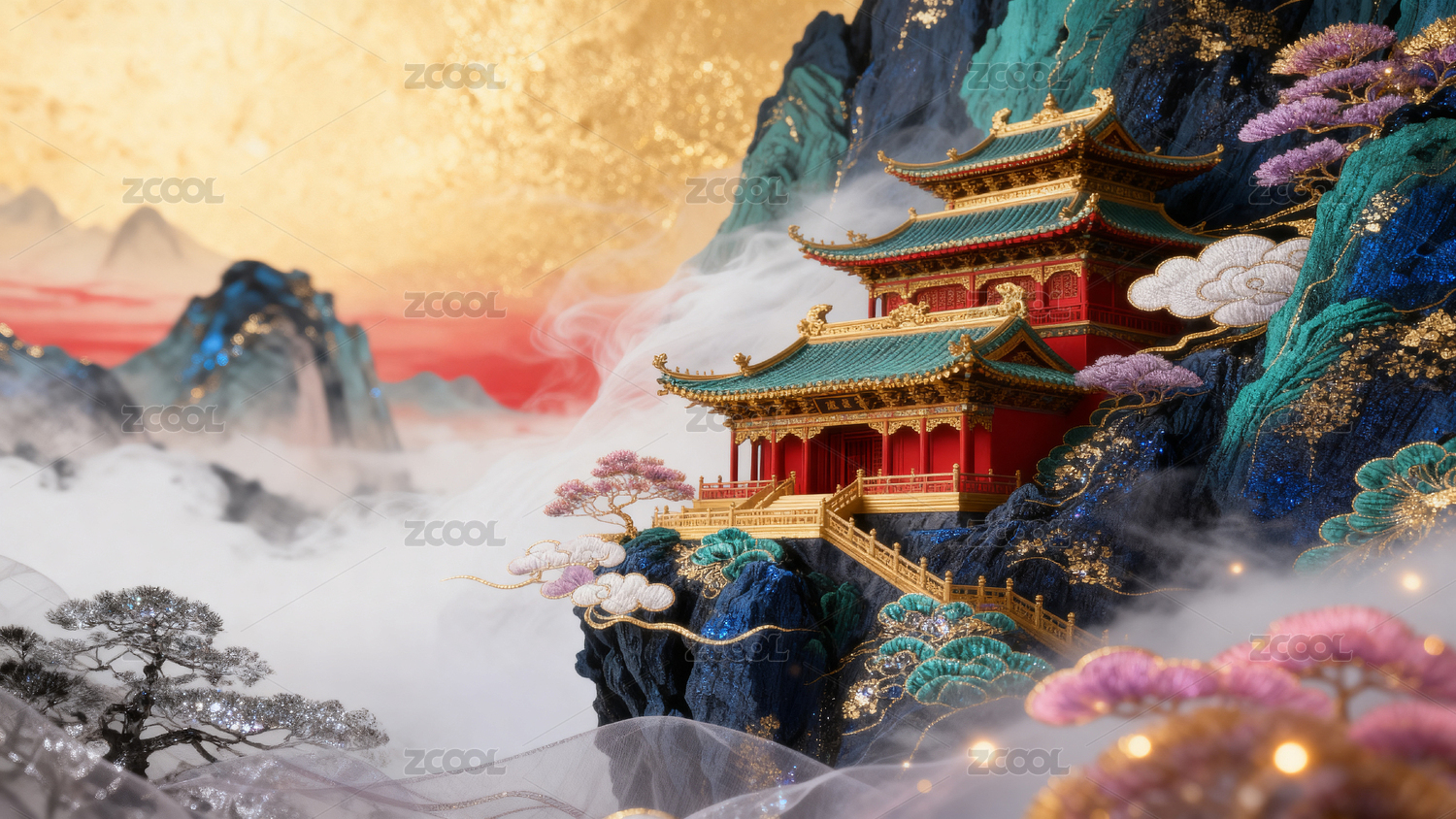 背景,立体,抽象,3D,古风,国画,楼阁,山峰,月亮