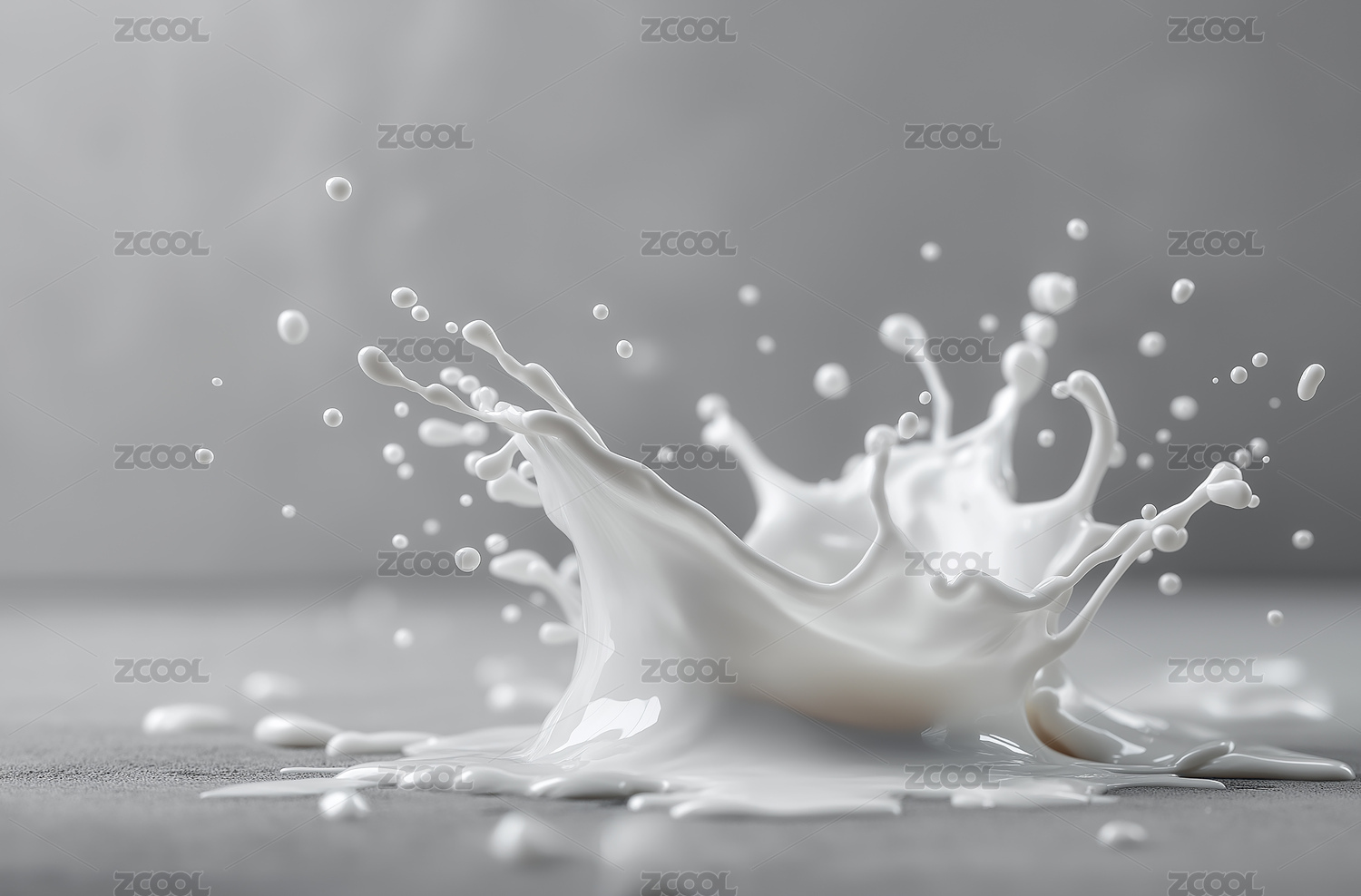 白色牛奶在灰色背景前飞溅 形成动态水花形