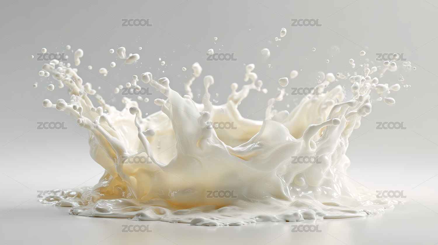 白色牛奶在灰色背景前飞溅 形成动态水花形