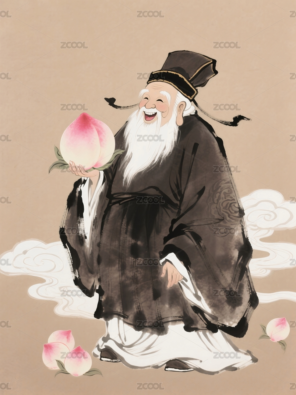 仙翁手捧寿桃祥云飘浮