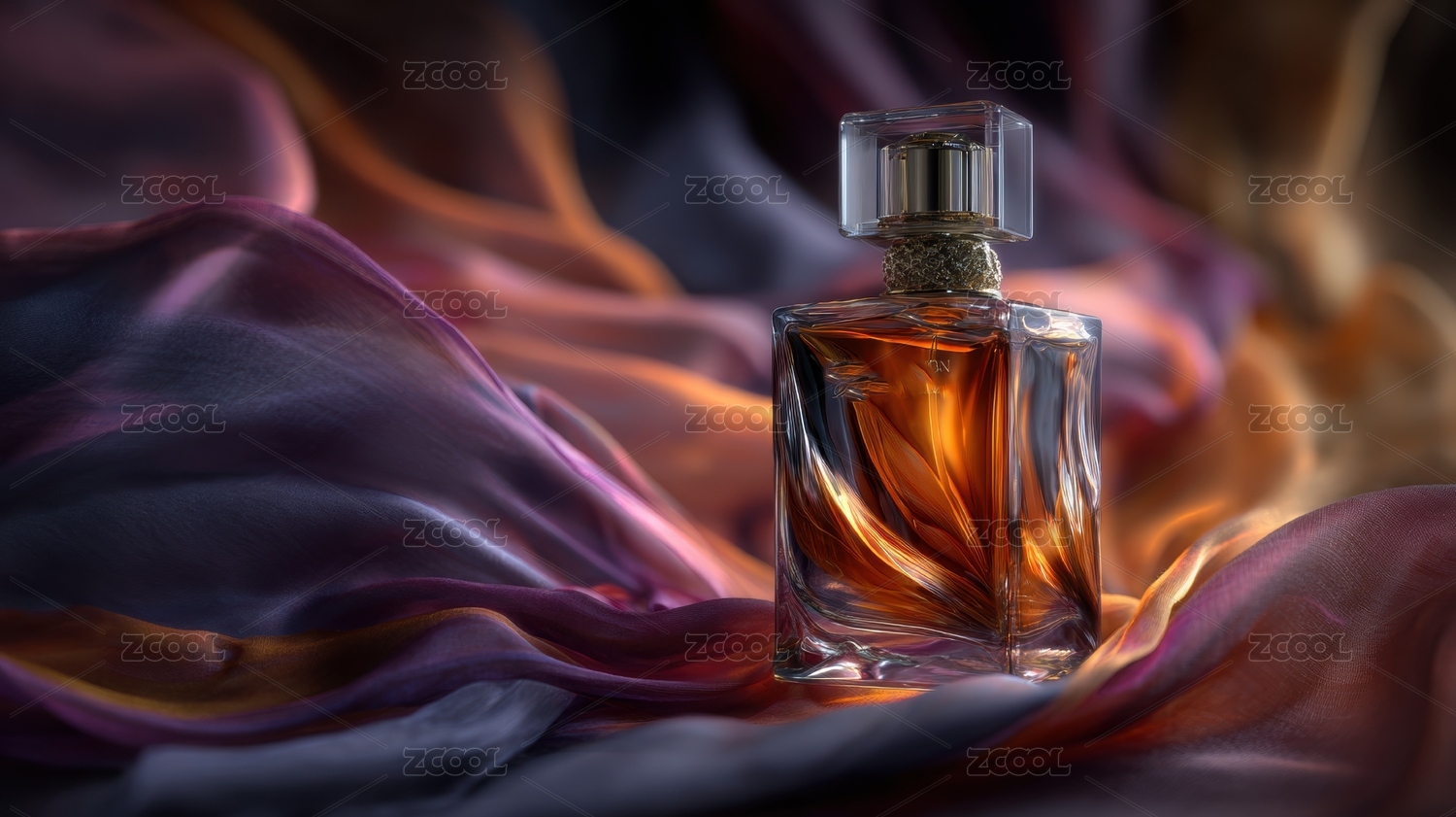 香水瓶置于色彩斑斓的丝绸之上