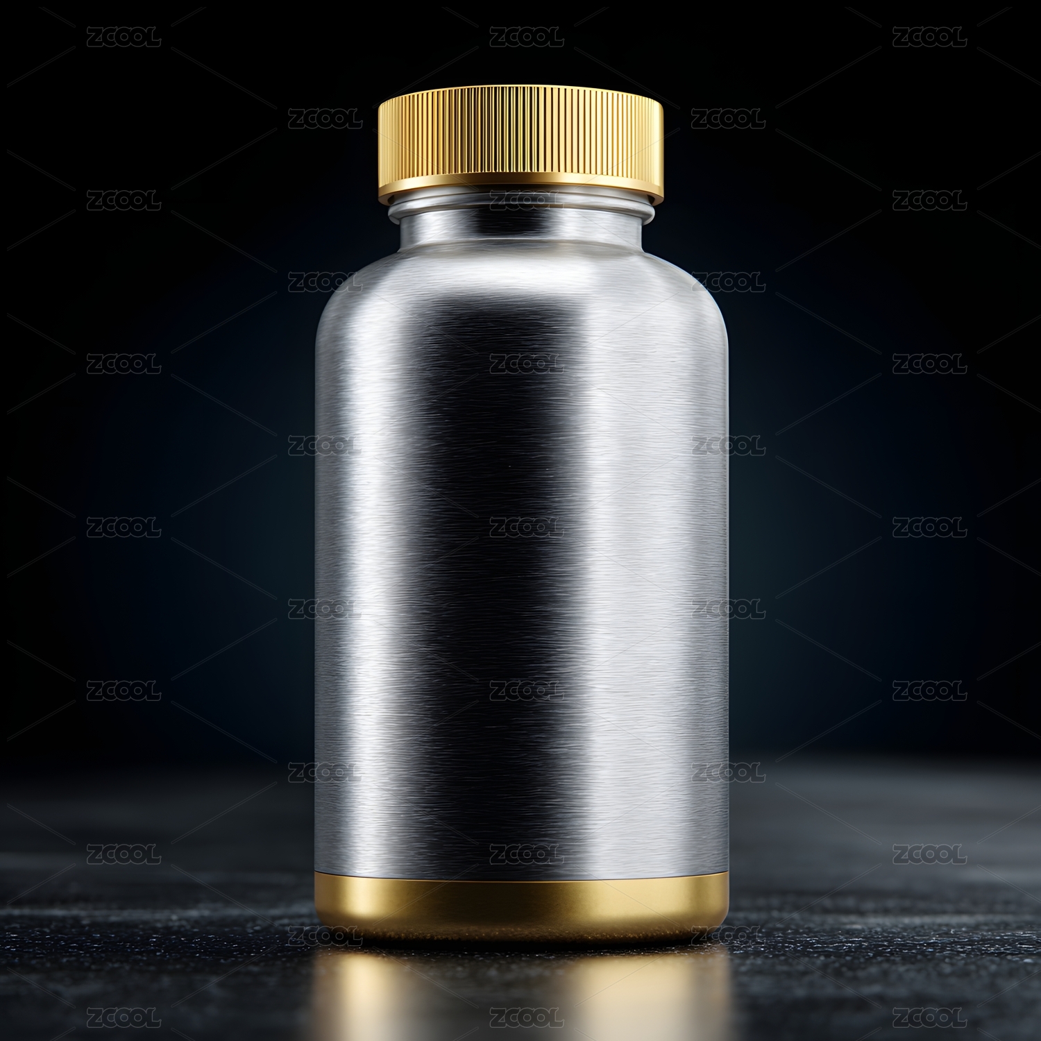 药瓶,瓶盖,瓶身,纯色背景,静物台,简约背景,静止,直立放置,金属质感,拉丝纹理