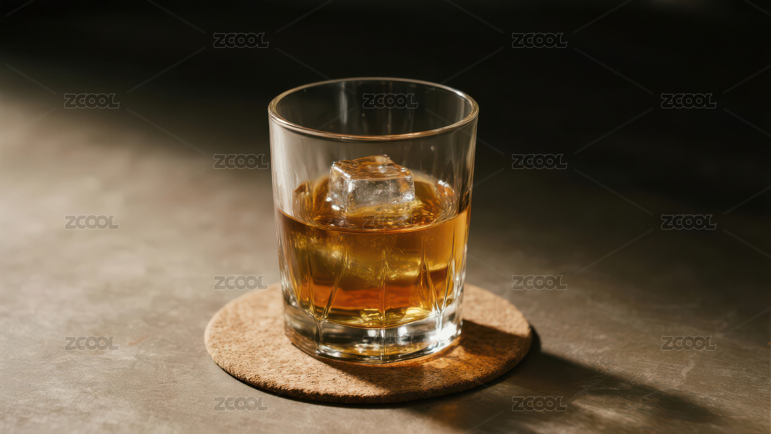 一杯加有冰块的洋酒与扁平酒瓶特写