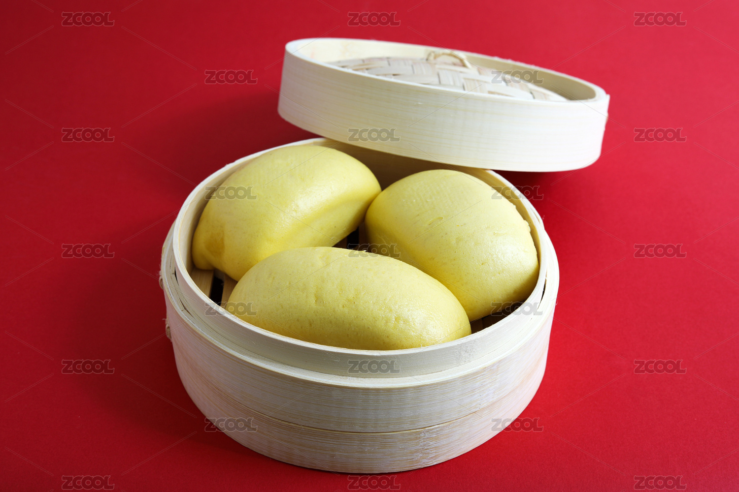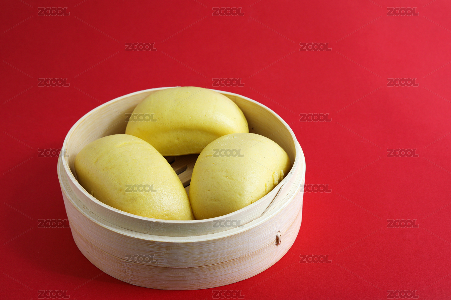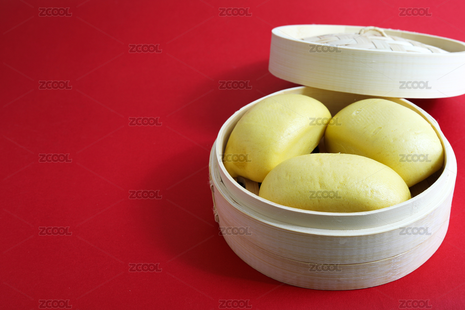 红色桌面上的一蒸笼传统早餐美食玉米馒头