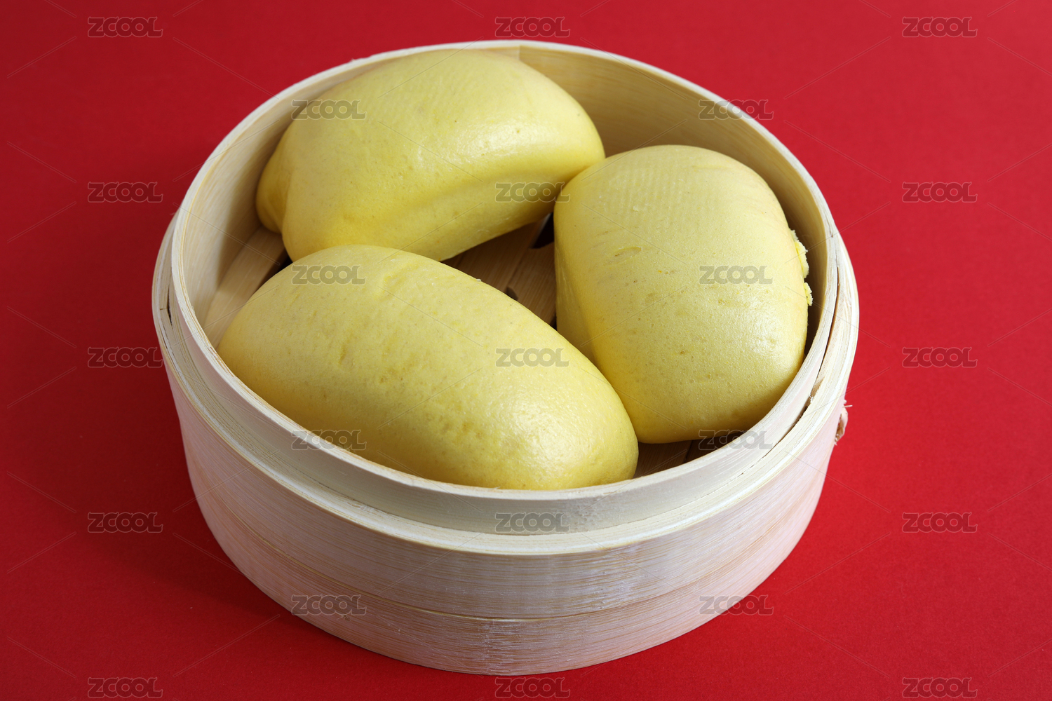 红色桌面上的一蒸笼传统早餐美食玉米馒头