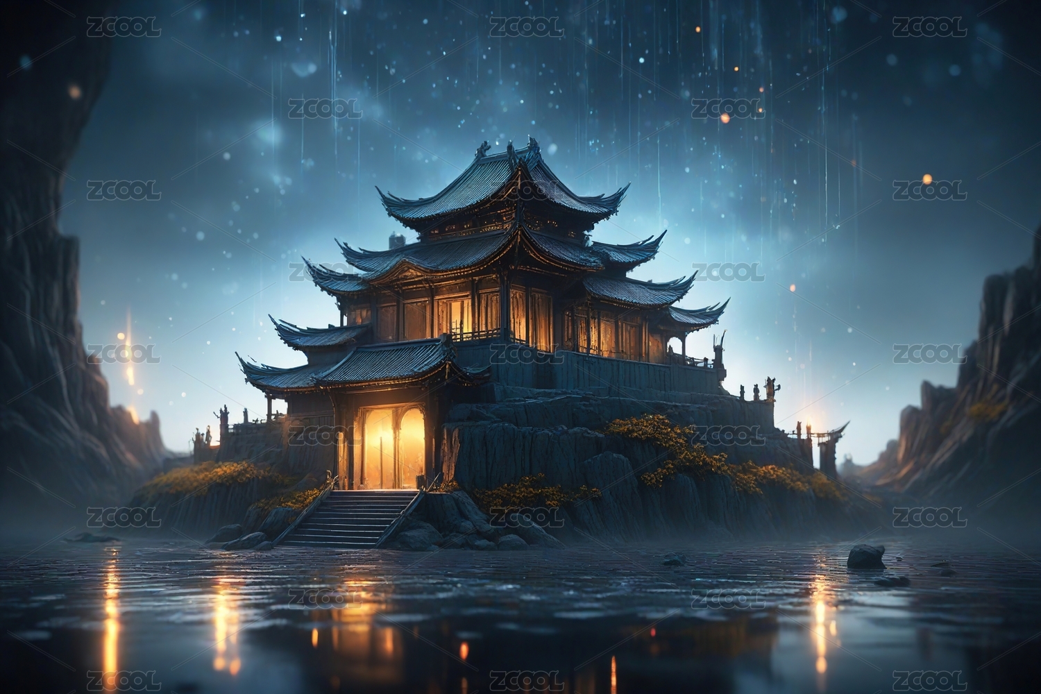 月光下的虚拟古代神话建筑场景