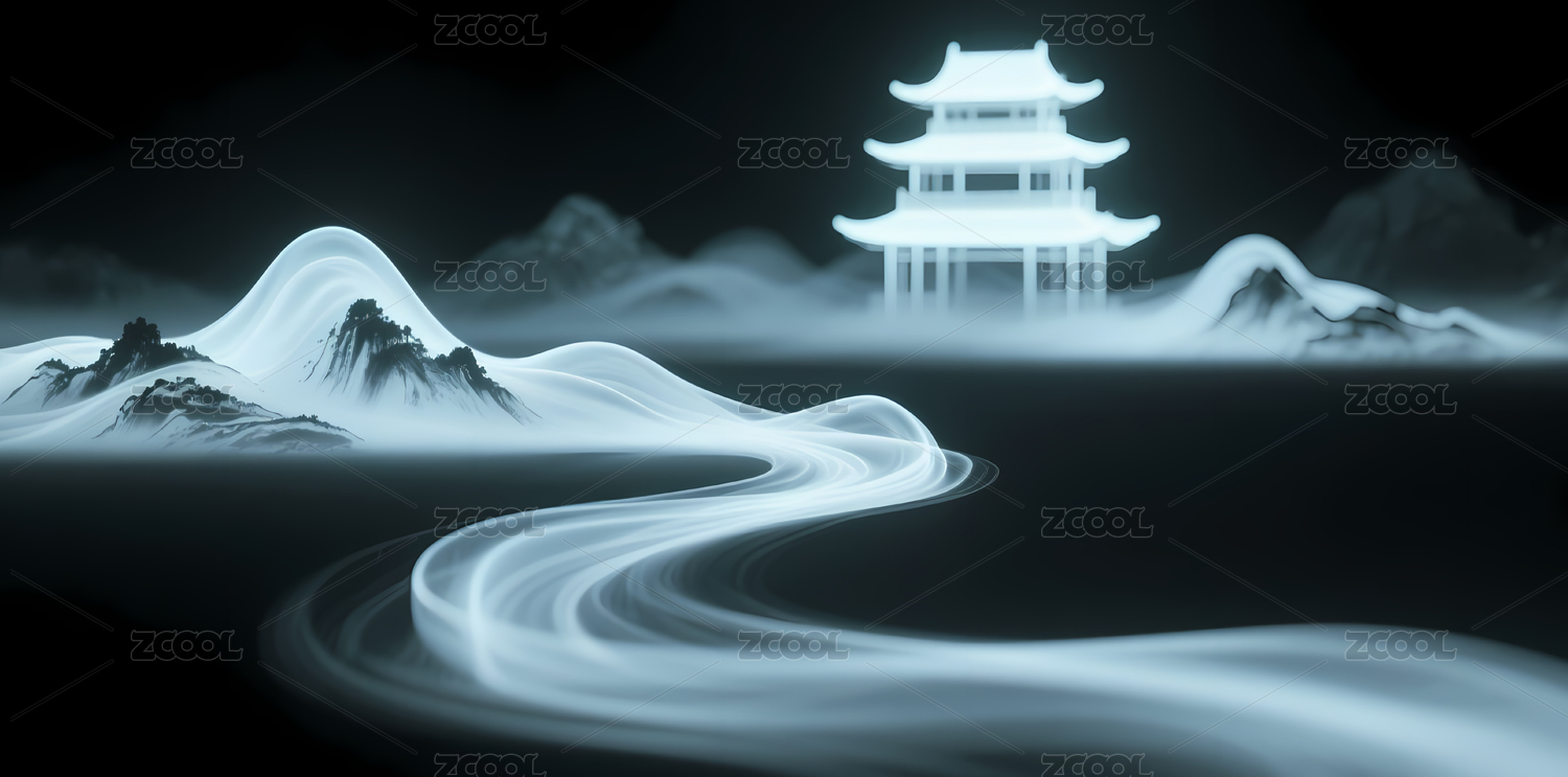 黑色烟雾流光水墨山水画