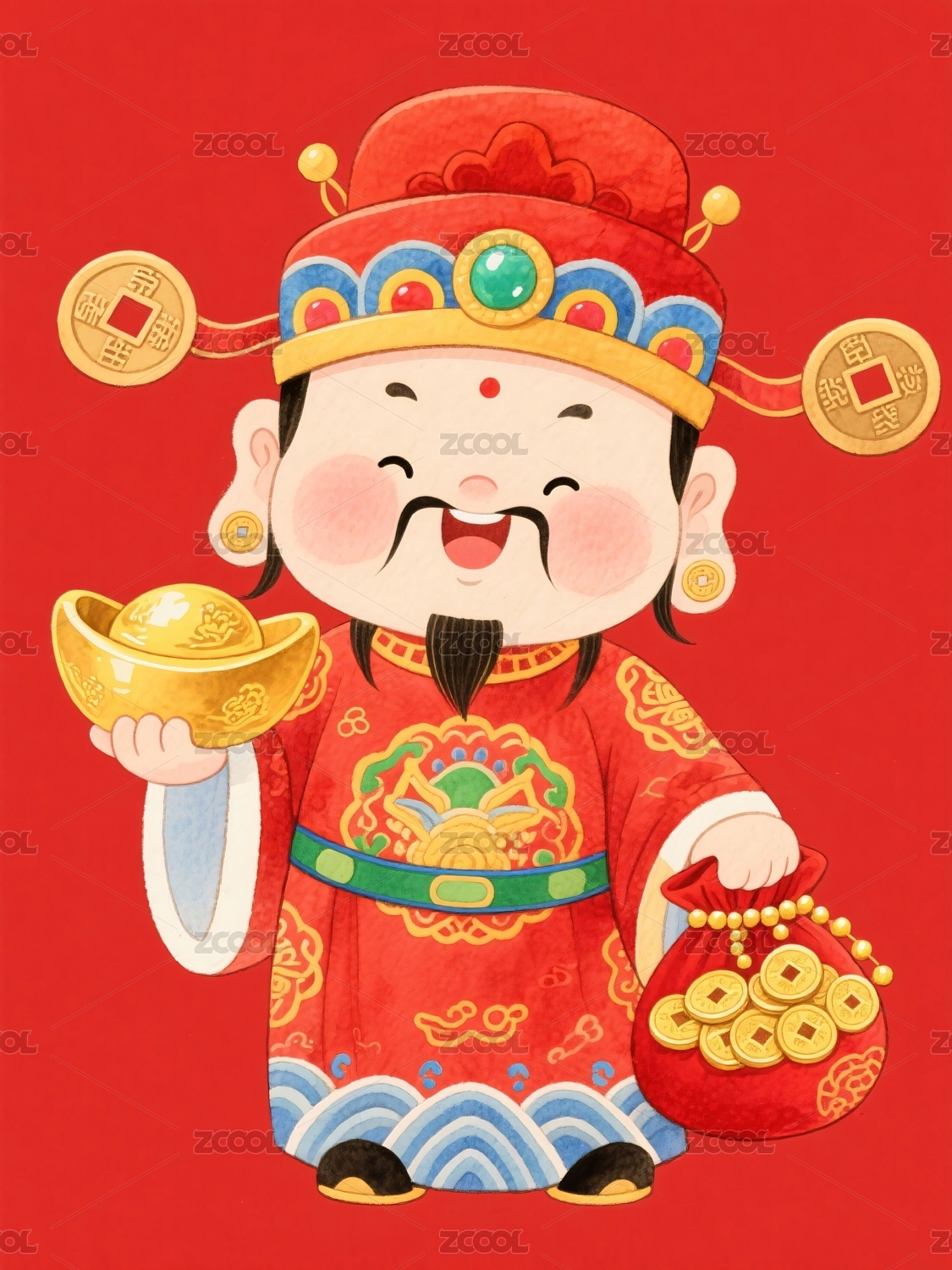 财神爷手持金元宝铜钱