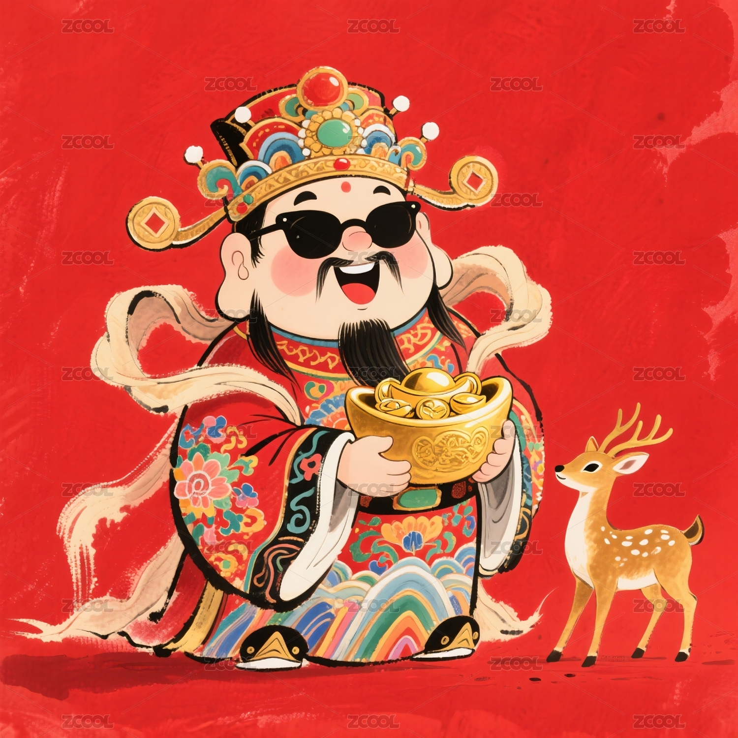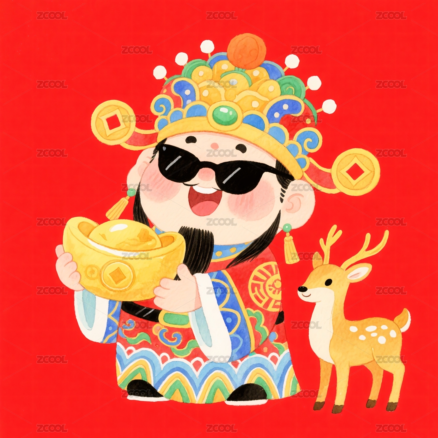 财神,金元宝,墨镜,福气,吉祥,喜庆,红色,财富,鹿,卡通