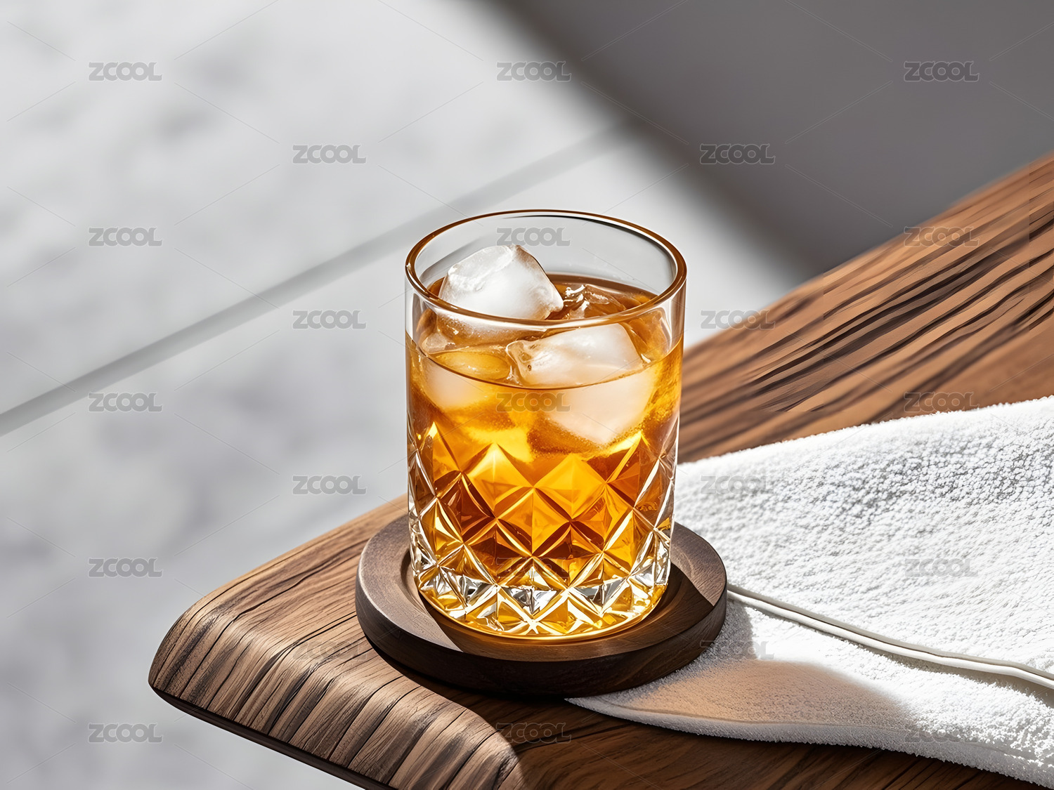 浅色台面上盛带柠檬片棕黄液体的玻璃杯