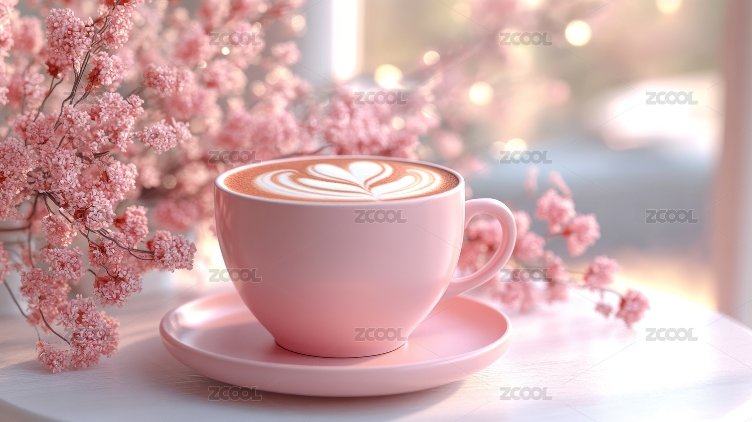 粉色咖啡与花