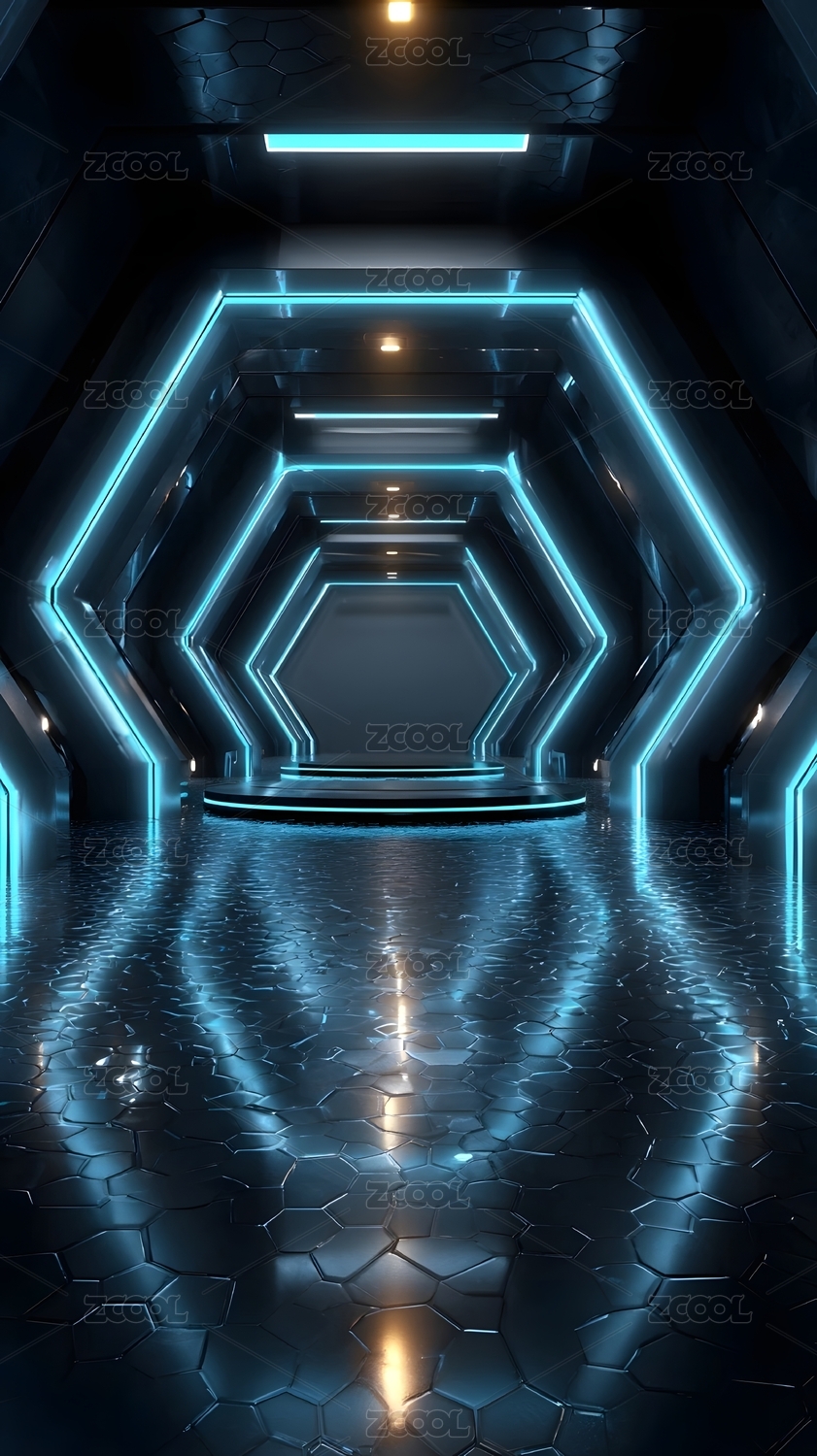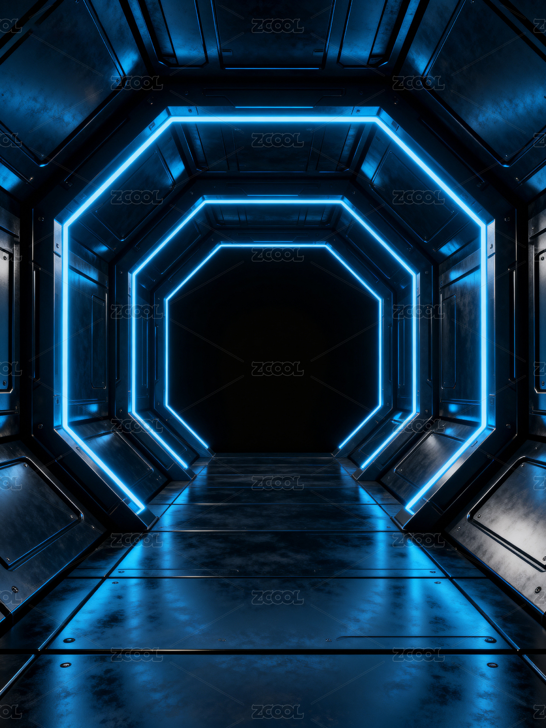 蓝色霓虹科幻走廊深邃延伸