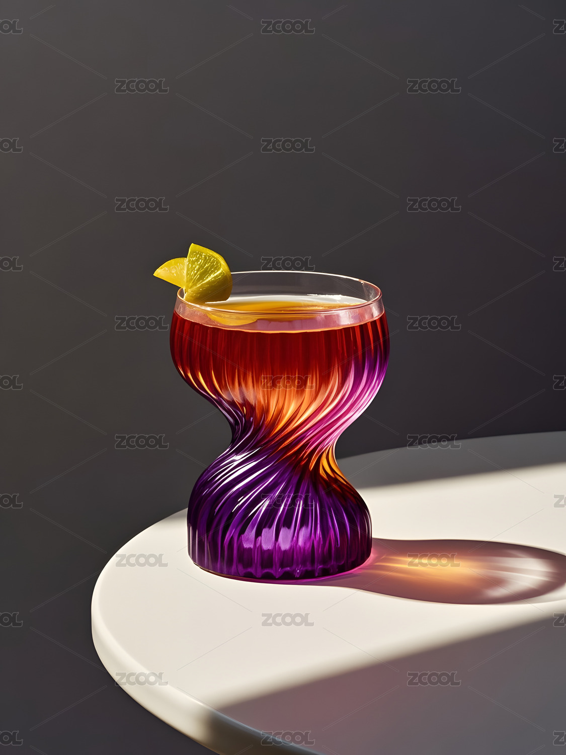 白色台面上盛带柠檬片饮品的造型独特杯子