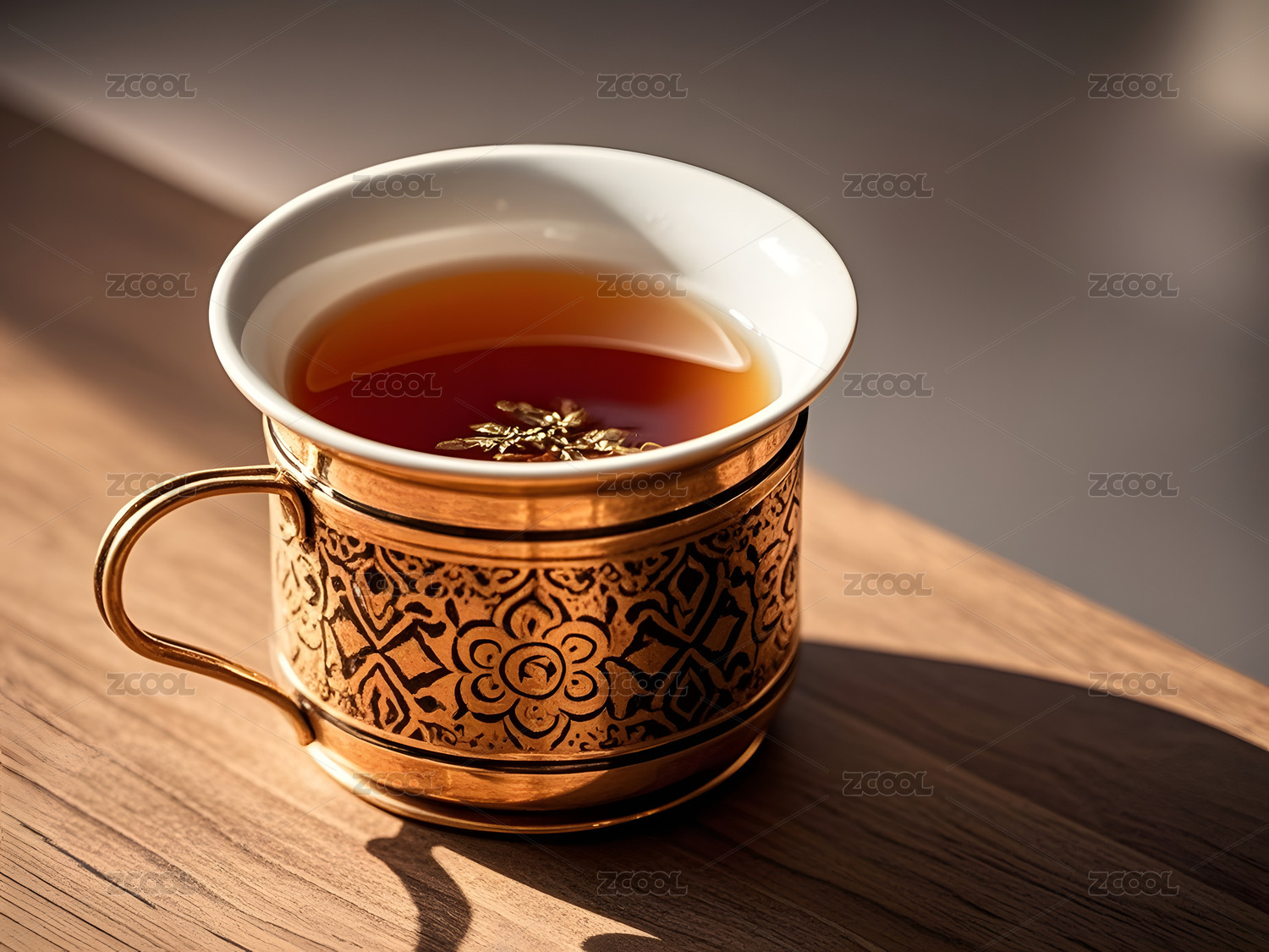浅棕色背景前盛热茶的花纹杯