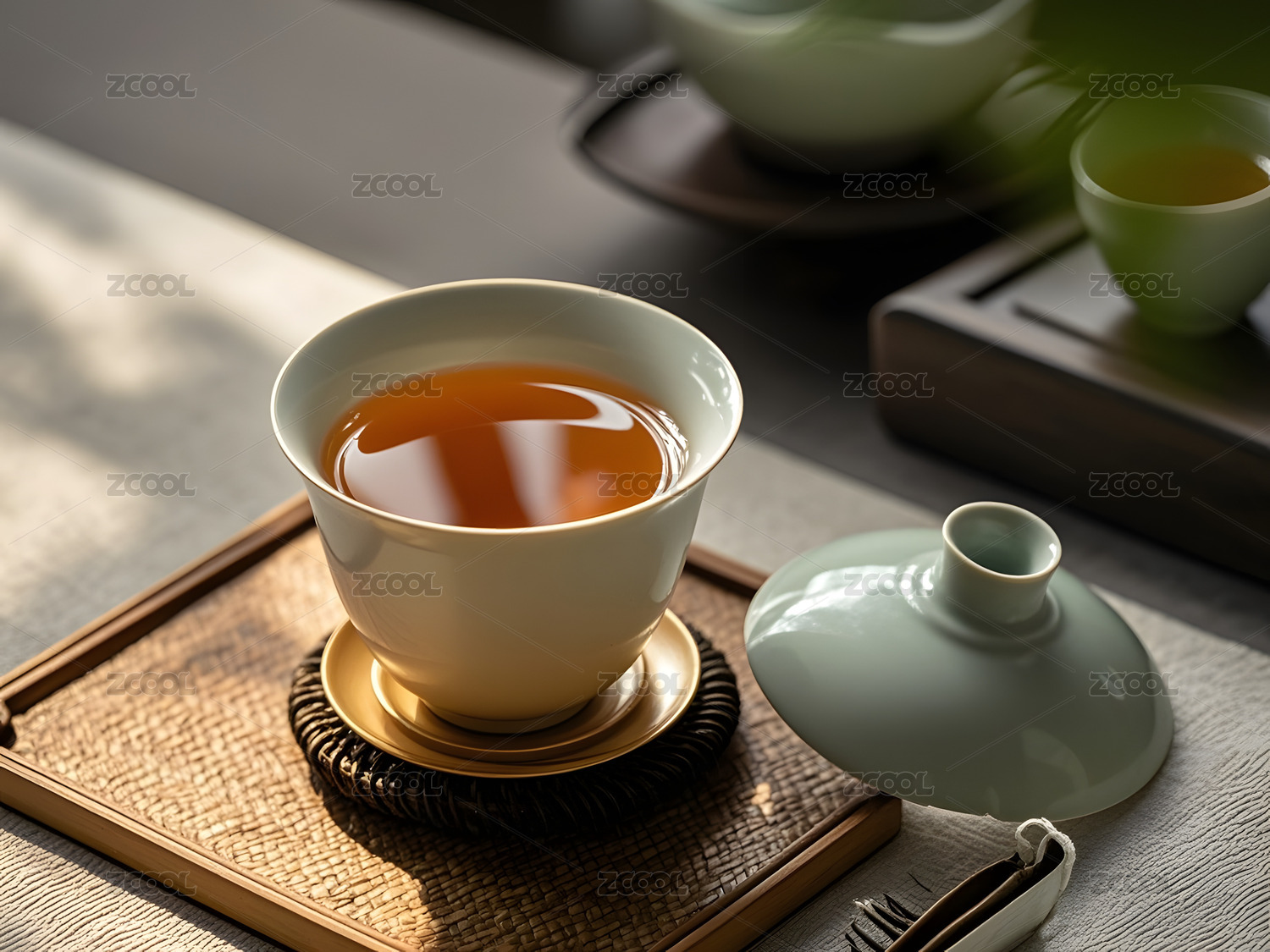 白瓷杯配青瓷茶具的中式茶歇场景