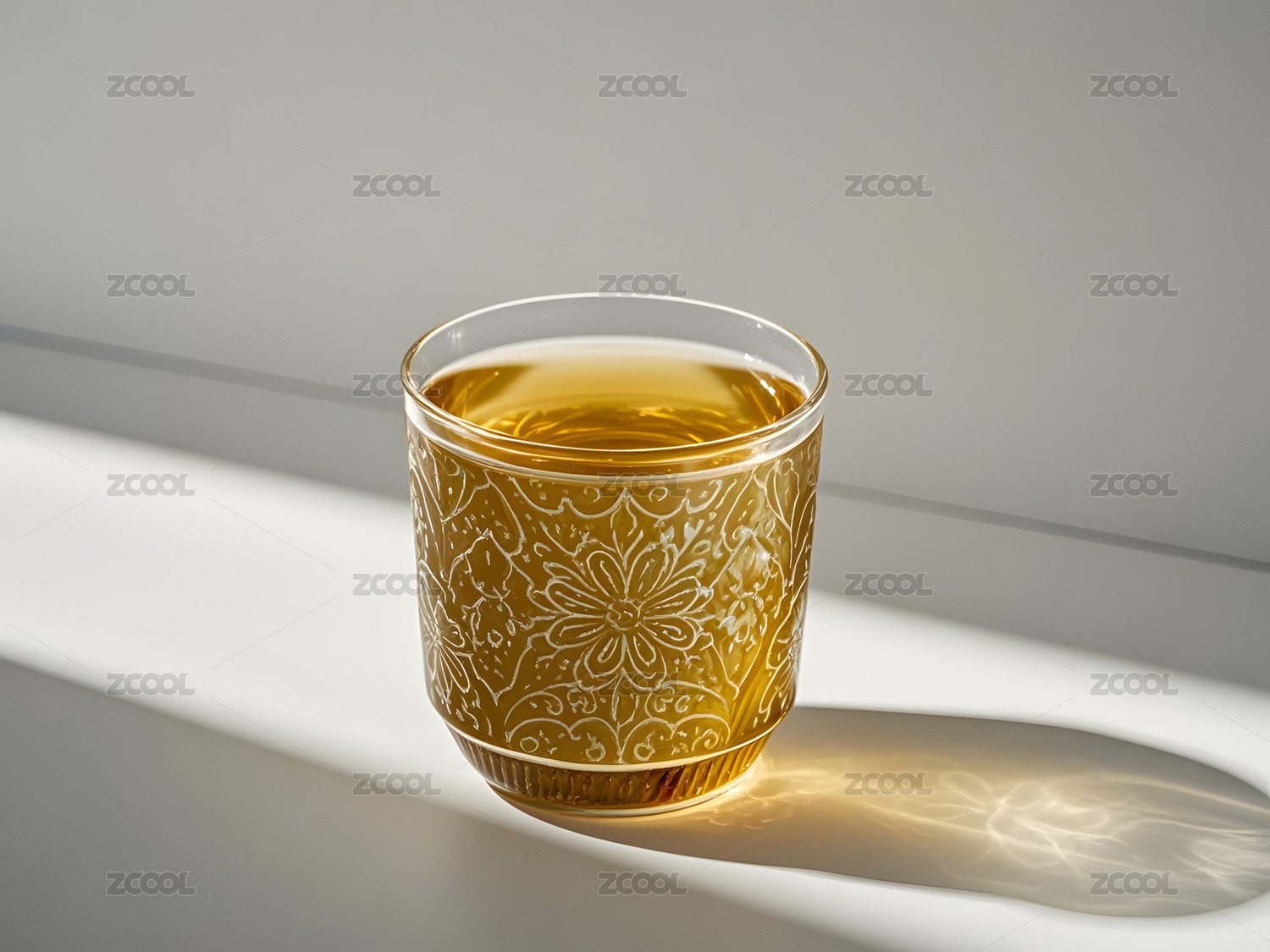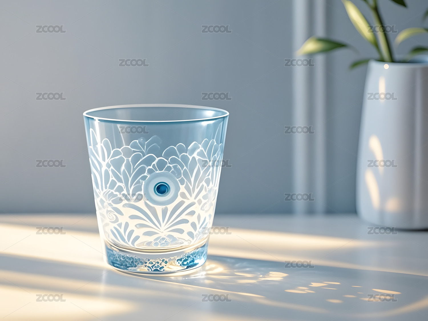 室内环境中带花纹的透明玻璃杯
