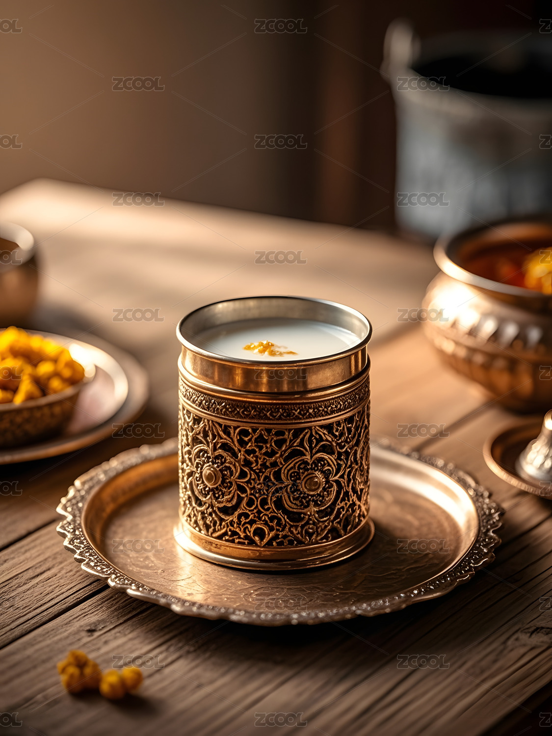 花纹杯装黄色饮品的特色摆拍