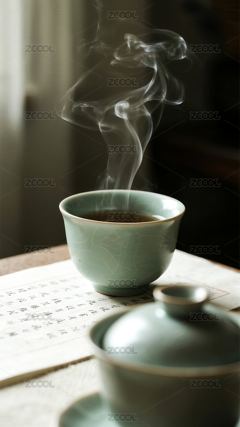 陶瓷茶具和袅袅飘散的沉香烟雾