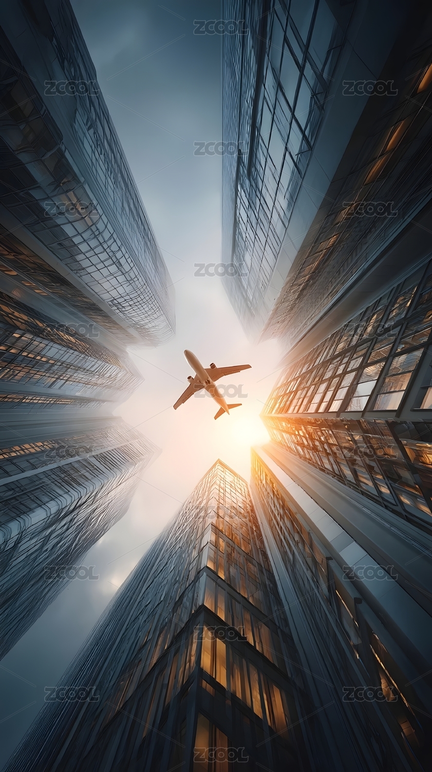 飞机飞越高楼城市景观
